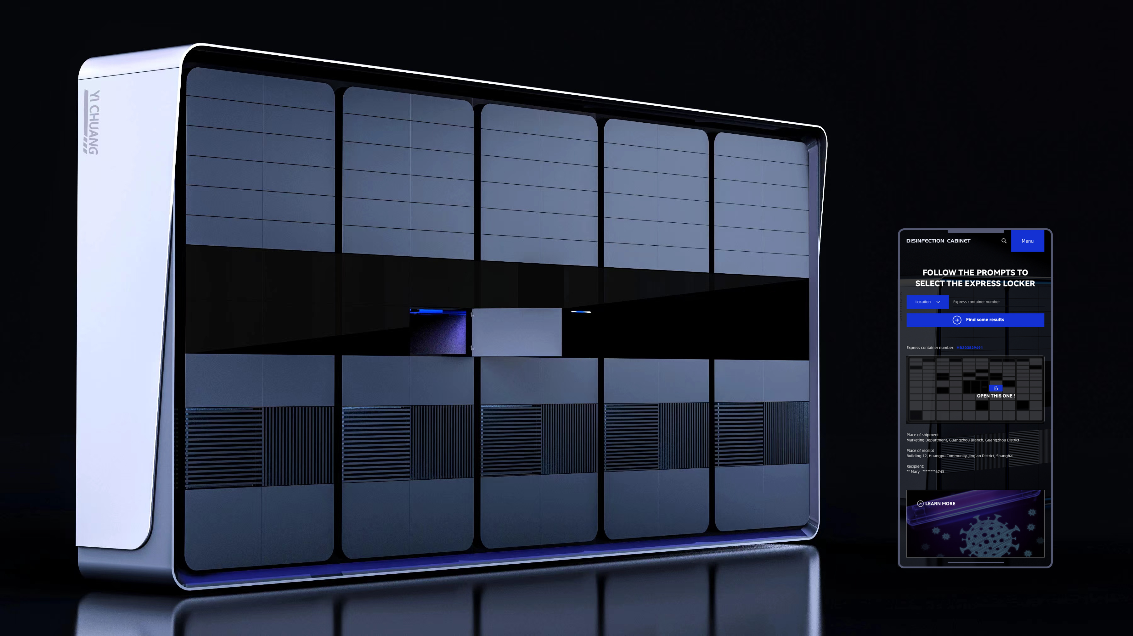 The "Touchless Modular Express Disinfection Cabinet" is designed to create an infection-free and express pickup tool for users. The Express Disinfection Cabinet is equipped with an ultraviolet disinfection lamp, which provides effective and automatic disinfection and sterilization for incoming expresses. The user can automatically open the cabinet door through APP related to it. The modular express disinfection cabinet can also be customized to assemble the disinfection cabinet according to the size of the post.