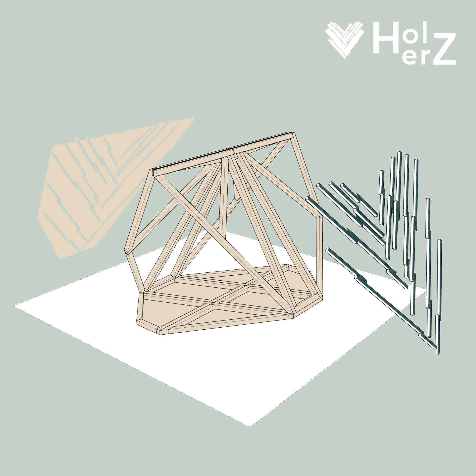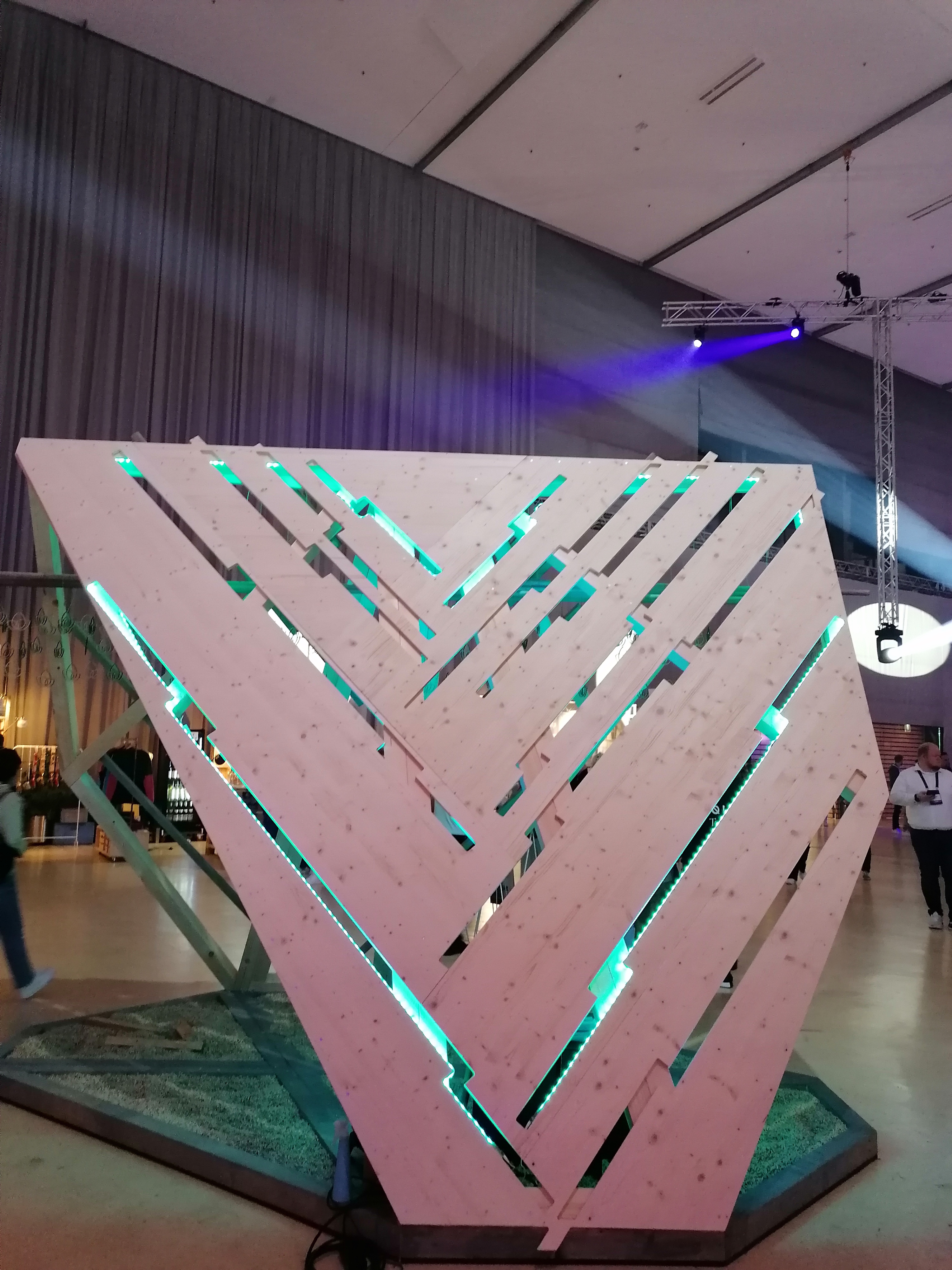 The COMMOD timber pavilion “HolzHerz” is an abstracted 3D heart that gives wood the stage it earns. The inside builds a pulsating room, enlighted with green colour of nature which leads our guests as a room divider into our office. Canopy of wooden flowers hovering above the heads of its visitors, giving them the feeling of standing outside in the woods. The fresh smell of the wooden construction is accompanied by a twitter of birds as soon as someone approaches the interior. Feeling the soft touch of wooden pellets beyond their feet all guests are floating through a wave of timber-heaven. By showing different types of wood – natural, coated, oiled etc. one gets to know the variety of woods and their areas of application. The pavilion is made of regional construction spruce and shows a different face from every step of the 360-degree accessibility and can be build up by 3 persons and easily transported. With this room divider we show all our visitors why we love wood and let them touch, feel, breath and smell besides seeing the ecological materials.