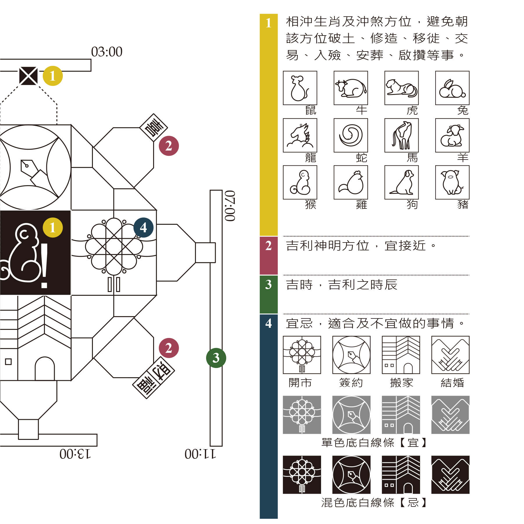 On the calendar in Taiwan, in addition to providing information regarding the records of ancestors’ wisdom – lunar calendar. It also tells people to welcome good fortune and avoid bad omens every day. Nevertheless, the information is provided in verbal form. “Day Code - Chinese Almanac” presents signs transposed from words. It also filtered and deleted some suggestions for incompatibility in the regular lunar calendar and selected reminders suitable for modern people: marriage, business contract, opening a business, moving, etc. to remind them which items are suitable or unsuitable to be done today.