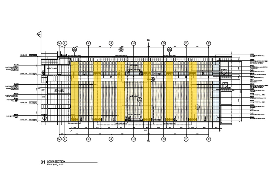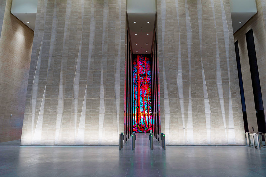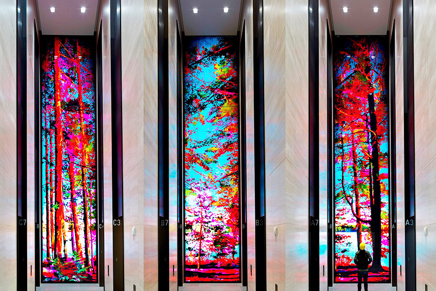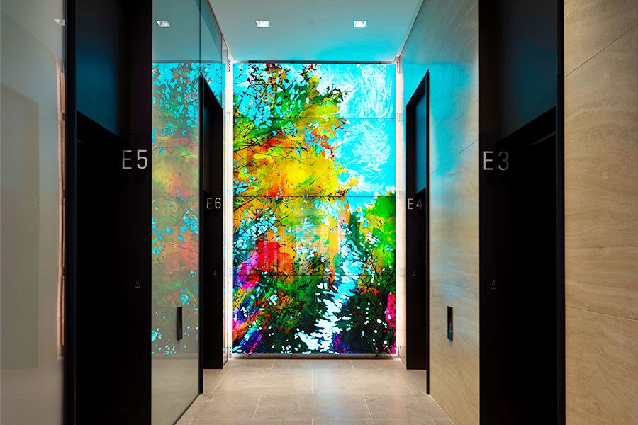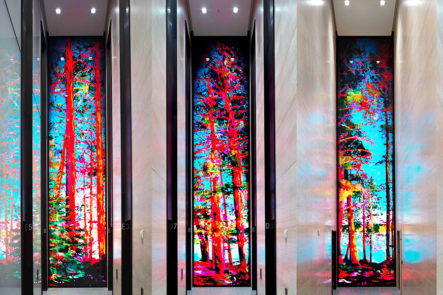 Merging sleek architecture and vibrant art is the newly completed 81 Bay Street building. Consisting of not one, but twelve massive custom illuminated art walls (six main lobbies at 37’ in height, and 6 sky lobbies at half size), GPI’s expertise in fine engineering and precise coordination of surface and lighting was necessary to bring Artist Steve Driscoll’s expressive and colorful works to life in backlit glass art panels. The mock up at GPI proved essential in determining several key things, including the optimal glass “recipe “to compliment the artwork, and the proper lighting color temperature to accurately enhance – without shifting – the hue of the original works. With intense color variations and amorphous forms spanning multiple stories, these art walls make for an intense experience in color, light, and scale.