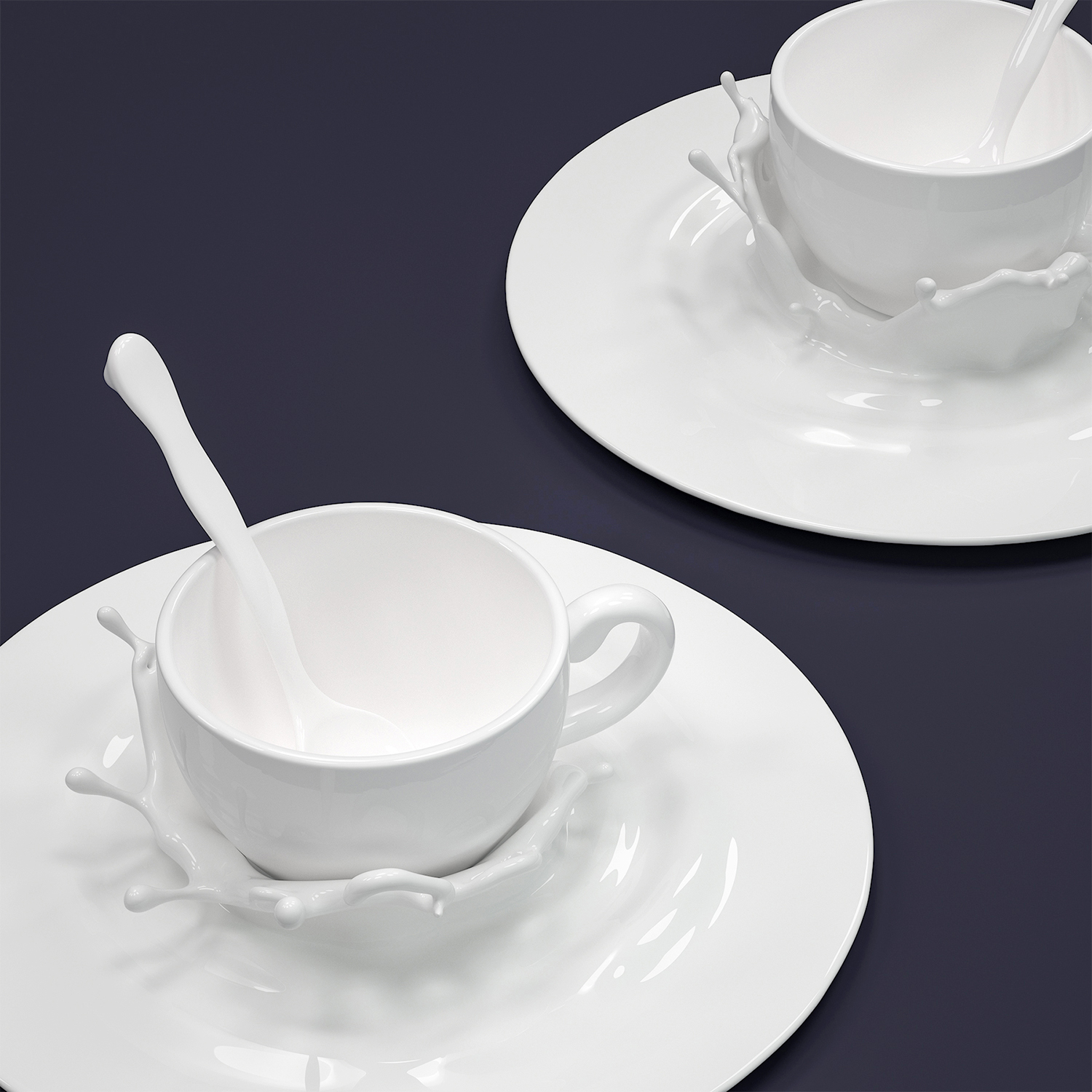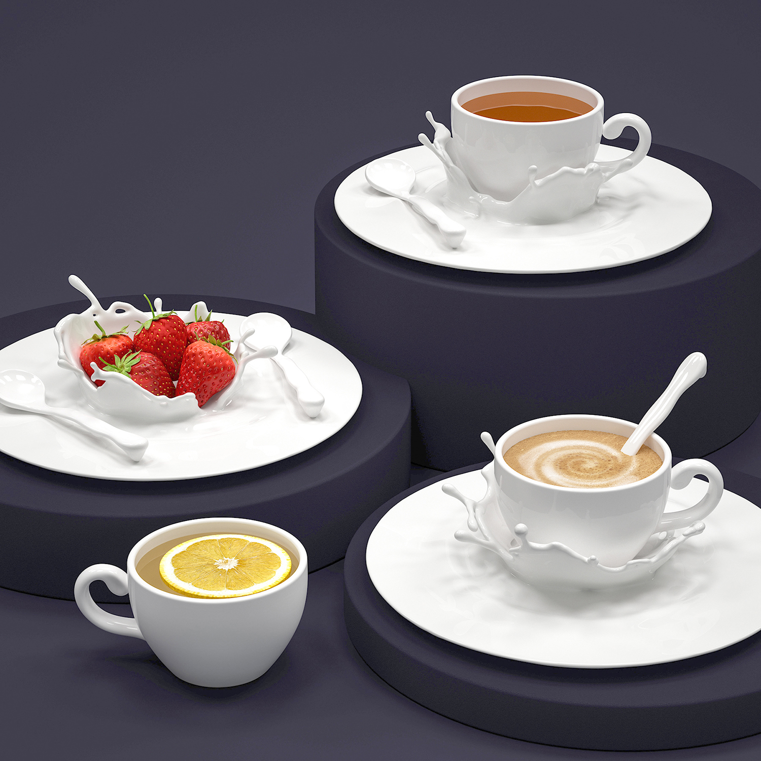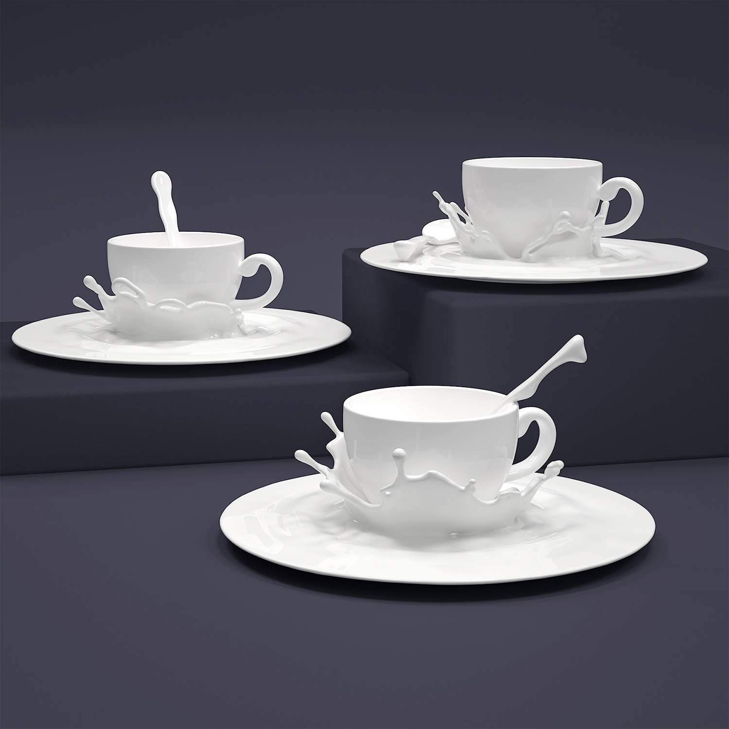 The inspiration of these cup and saucer sets came from the blending process of coffee and milk. The project intends to capture the beauty of fluid by simulating random movements of liquid flows. When two liquids run into each other, the collision on the surface creates irregular crown splashes which then melt into the ripples. These random abstract shapes add interesting features to the tableware and makes the food more attractive. The solid structures allow the saucers to hold more food as well. Porcelain material provides minimalist aesthetics with senses of cleanness and ease. Smooth and clean appearance can deliver a psychological feeling of hygienic, which can improve people’s appetite to some extent.