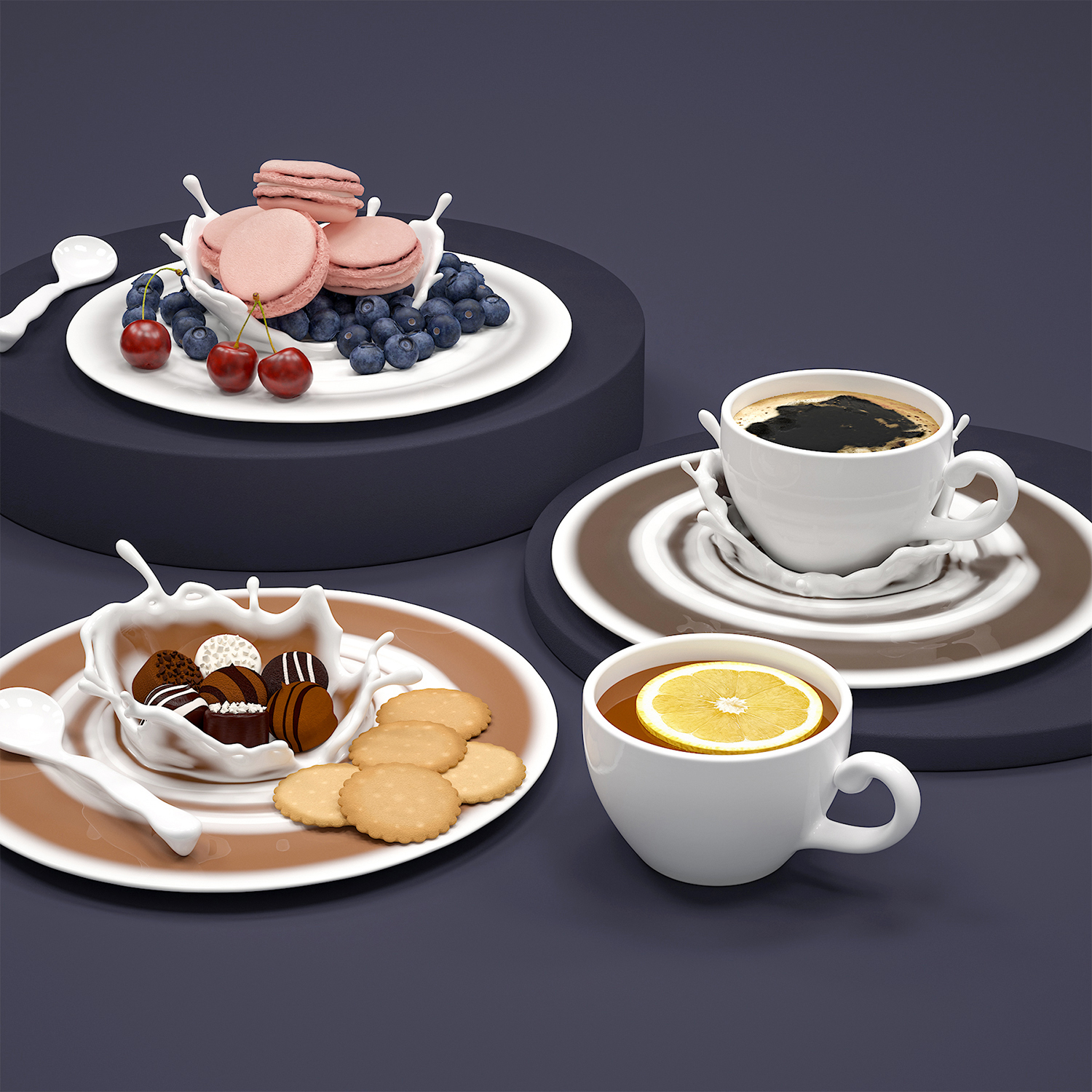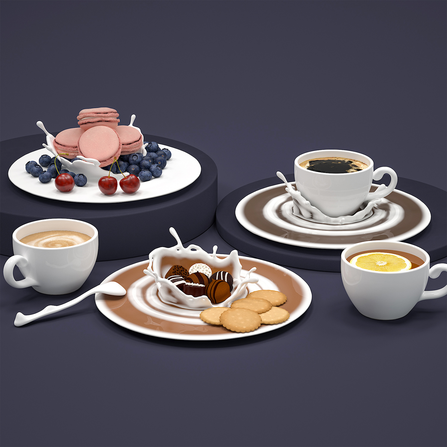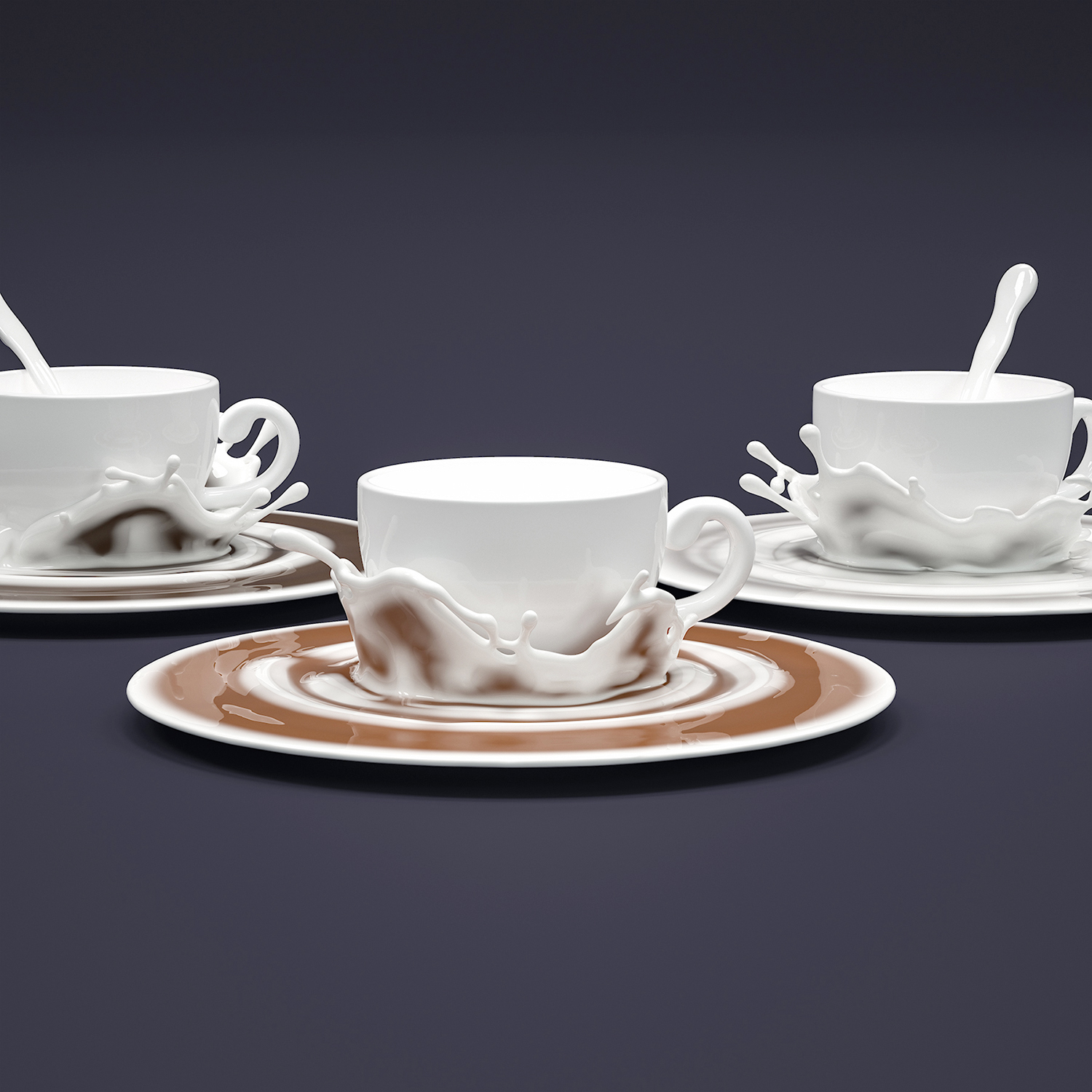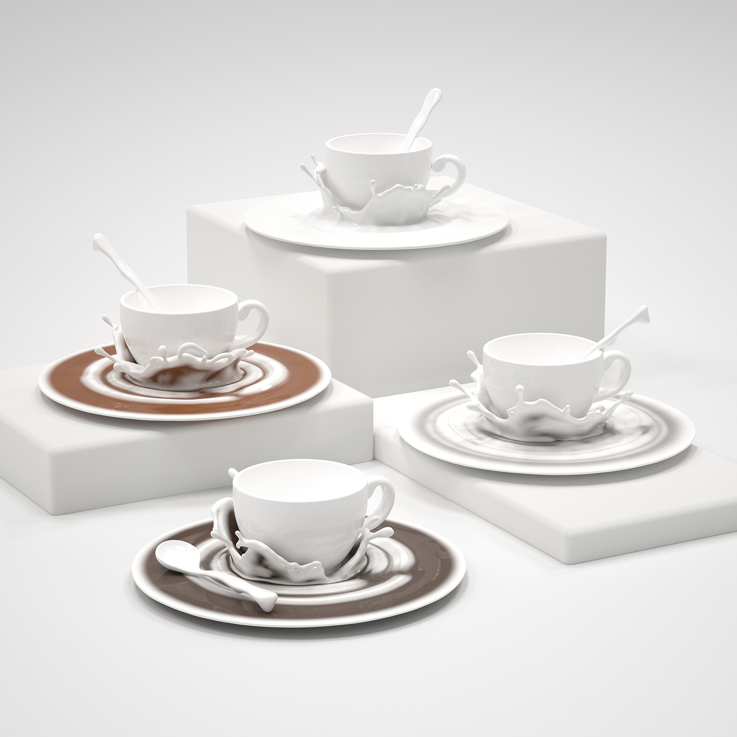 The inspiration of these cup and saucer sets came from the blending process of coffee and milk. The project intends to capture the beauty of fluid by simulating random movements of liquid flows. When two liquids run into each other, the collision on the surface creates irregular crown splashes which then melt into the ripples. These random abstract shapes add interesting features to the tableware and makes the food more attractive. The solid structures allow the saucers to hold more food as well. Porcelain material provides minimalist aesthetics with senses of cleanness and ease. Smooth and clean appearance can deliver a psychological feeling of hygienic, which can improve people’s appetite to some extent.