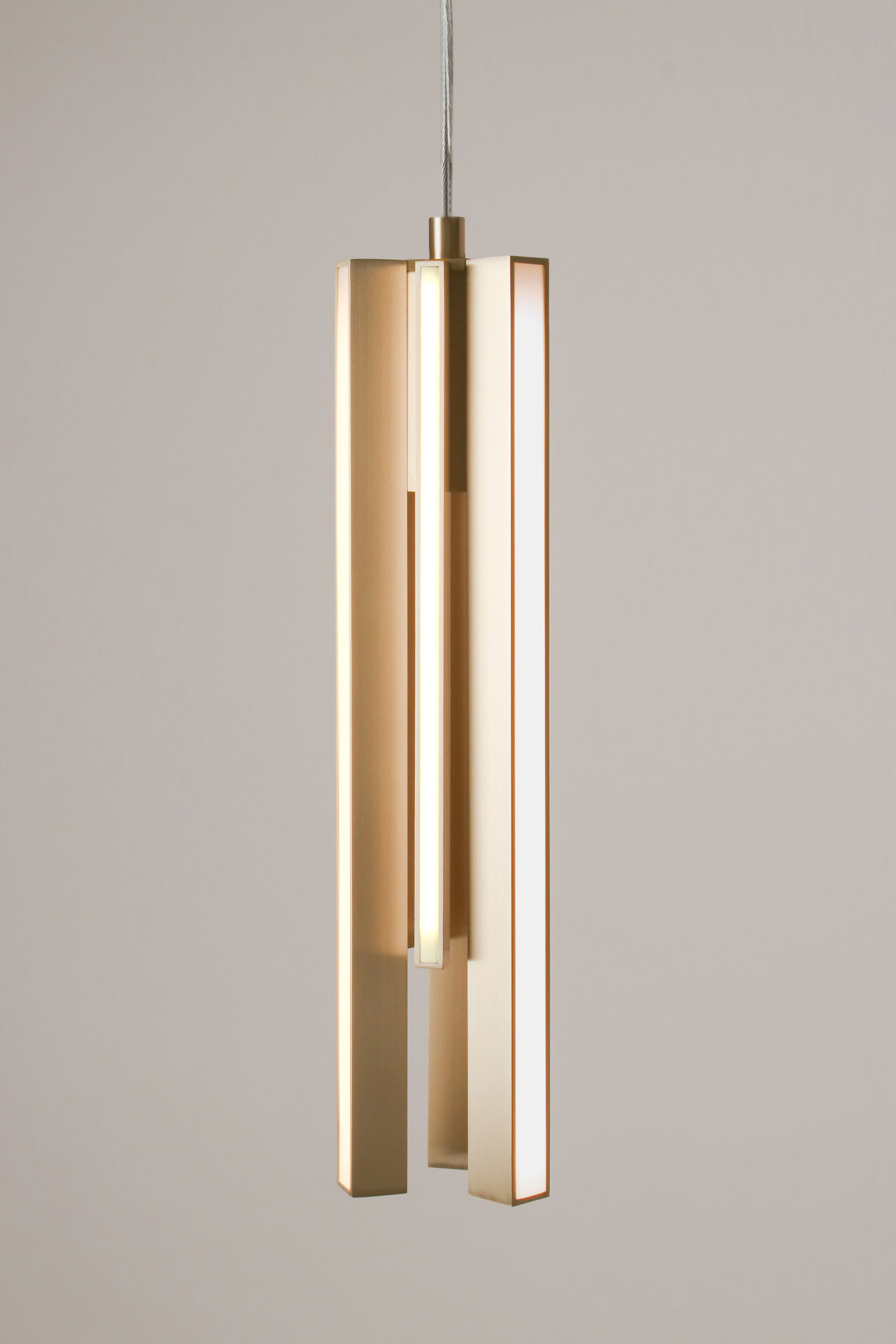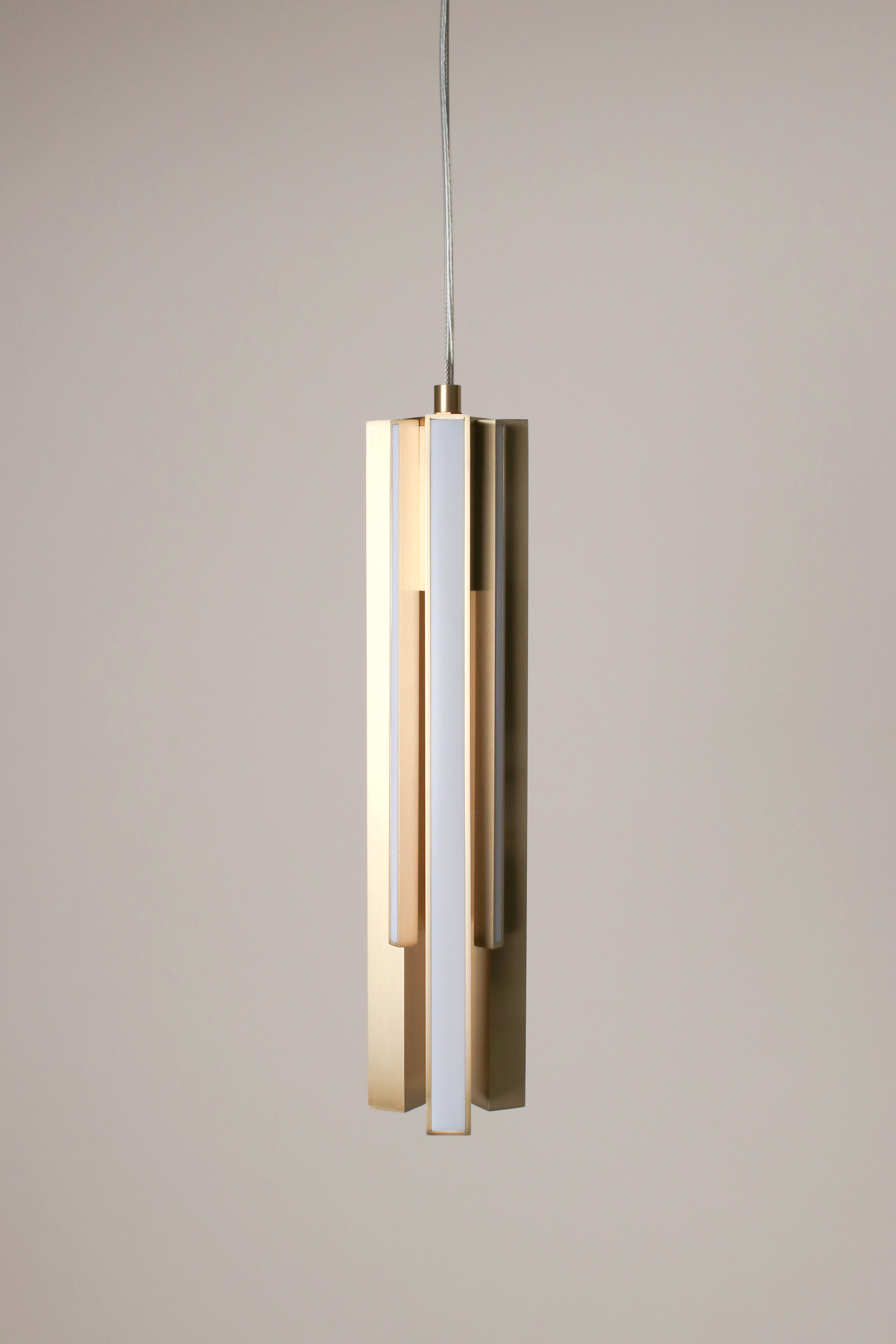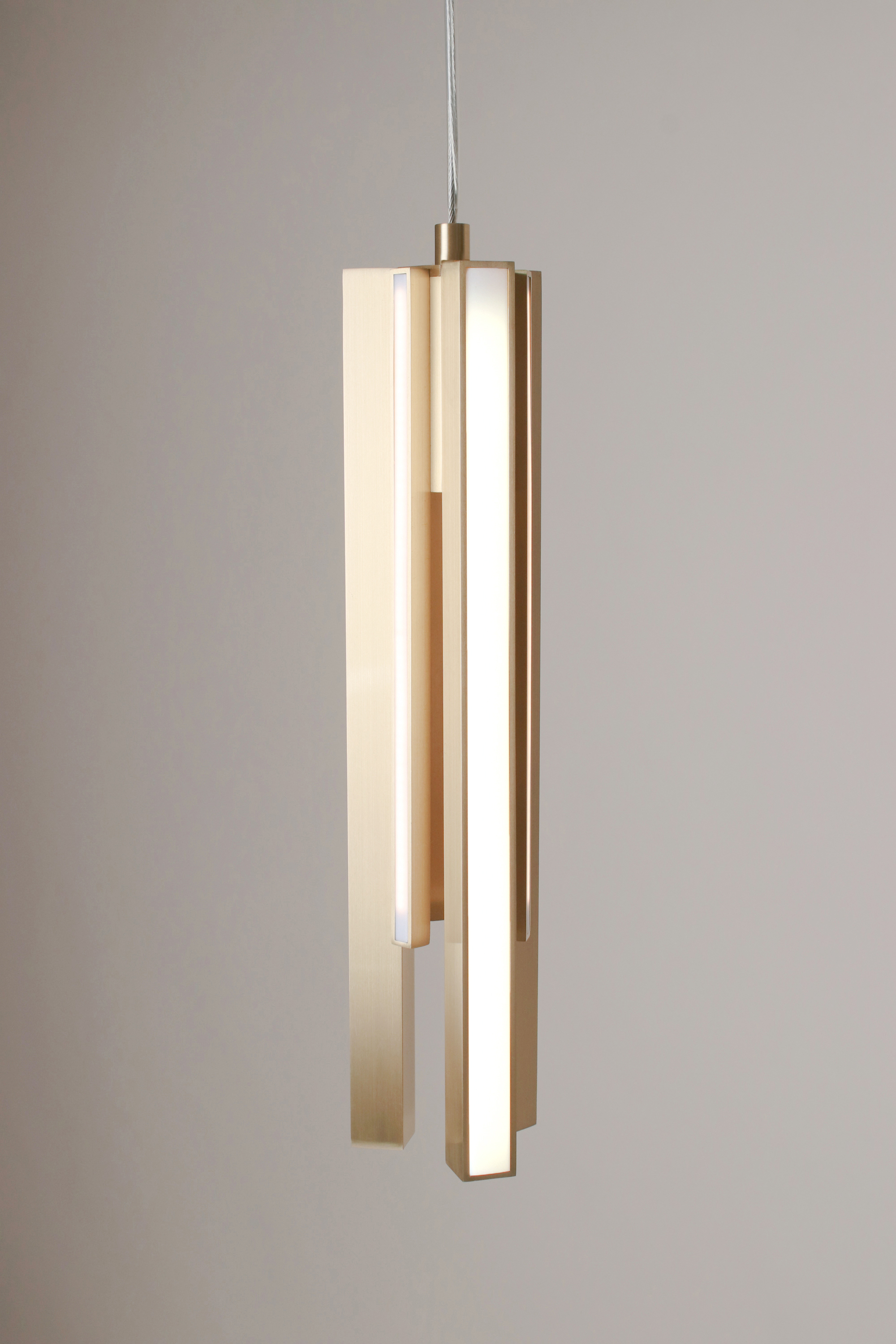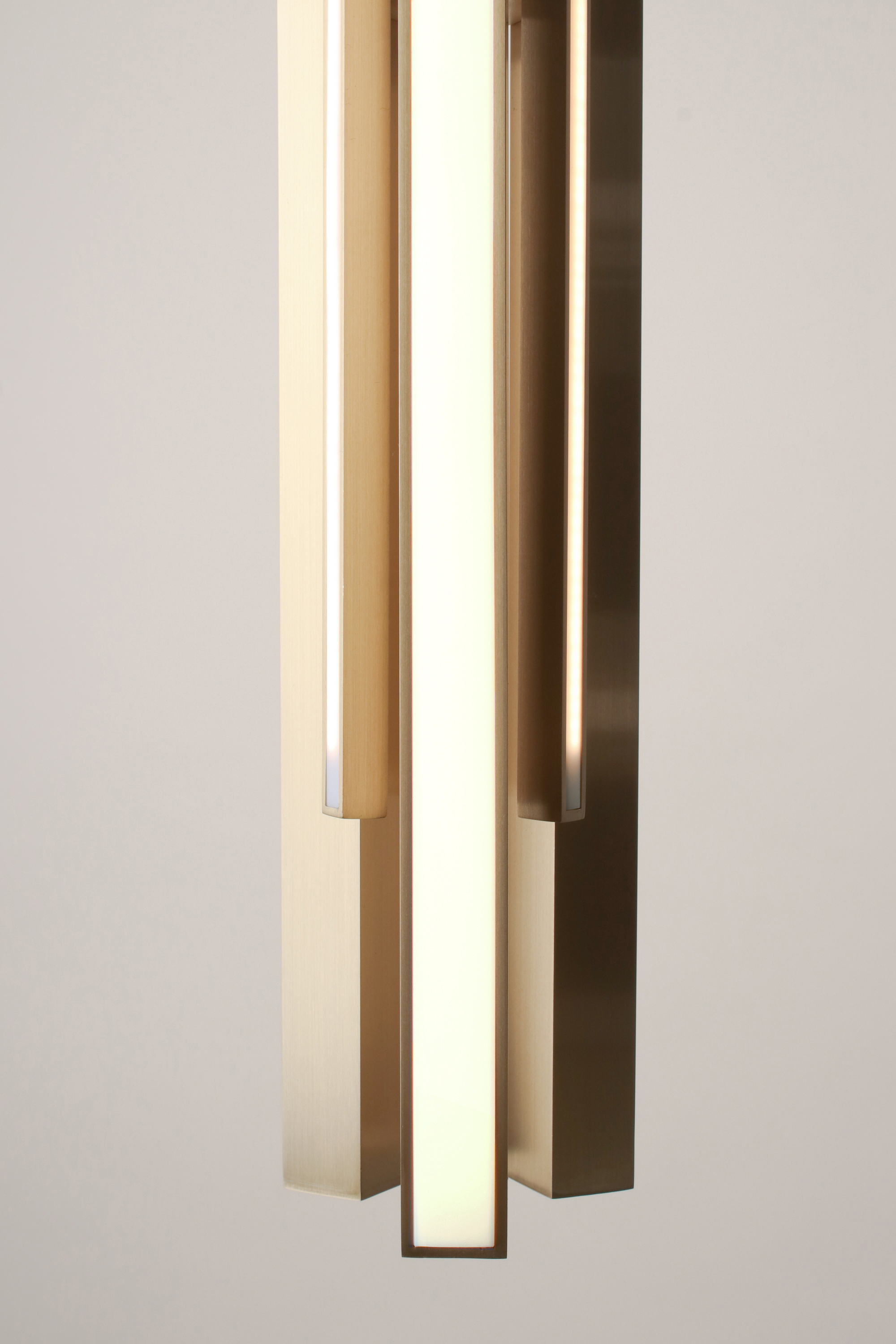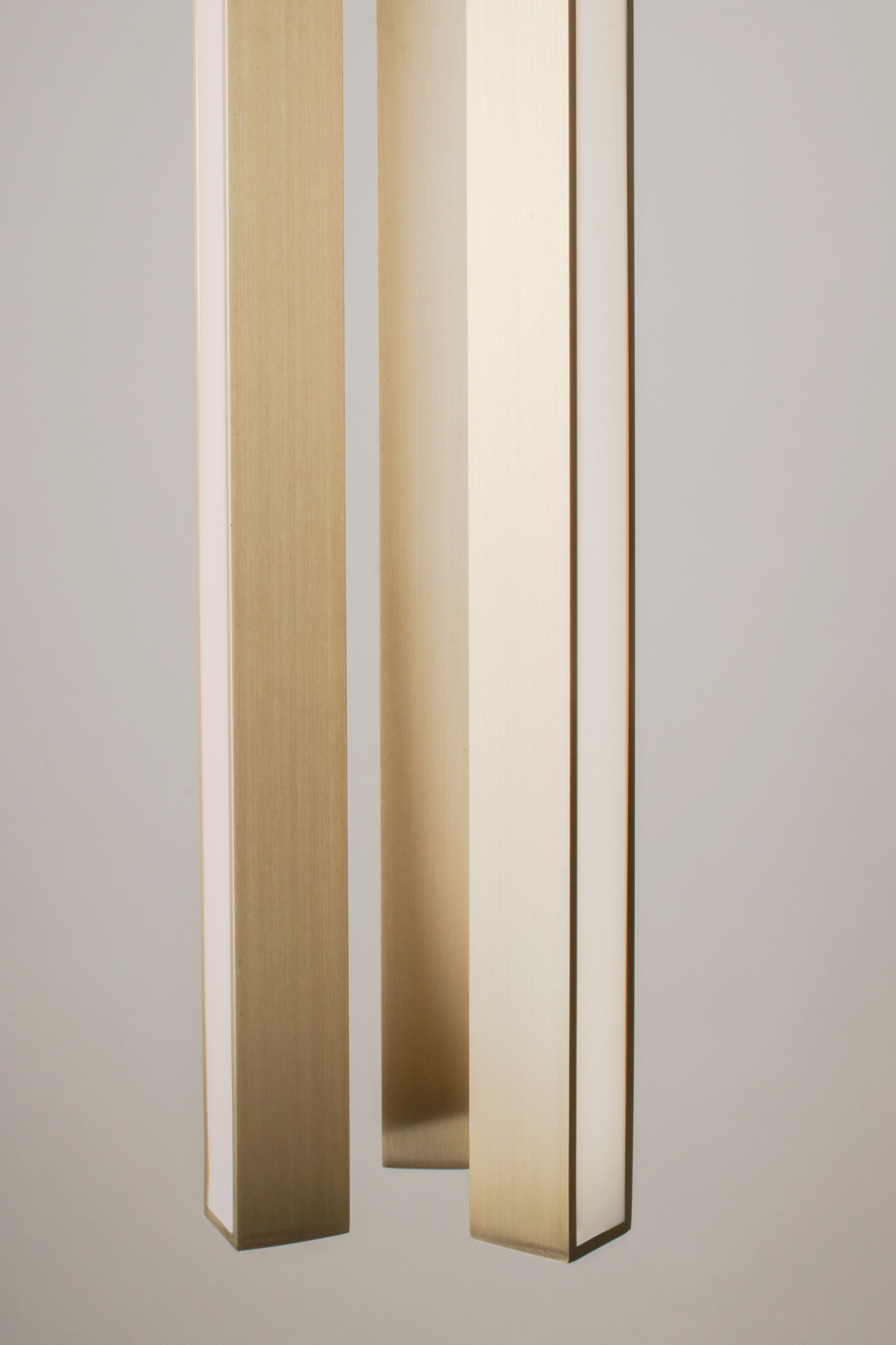 The series embodies symmetrical harmony, with lineal lengths fixed meticulously to a central hexagonal piece, presenting flashes of the brass facade between channels. Simultaneously this central column discretely integrates the mechanisms of the light within.