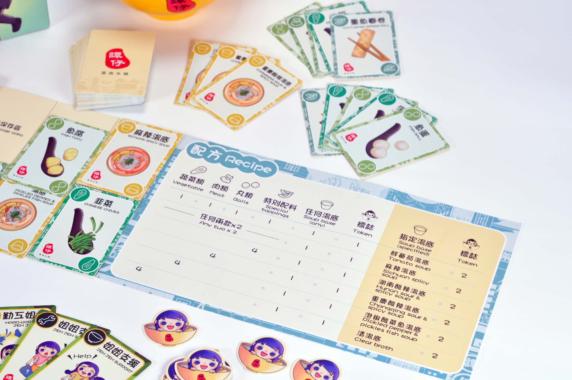 The soup base and toppings from TamJai Yunnan Mixian is now integrated into this board game. TamJai Jeh Jeh uses an interesting way to show the diversity of combinations in TamJai. Players have to combine different toppings according to the recipes to exchange for bowl tokens. The fastest one to get three tokens is the winner.