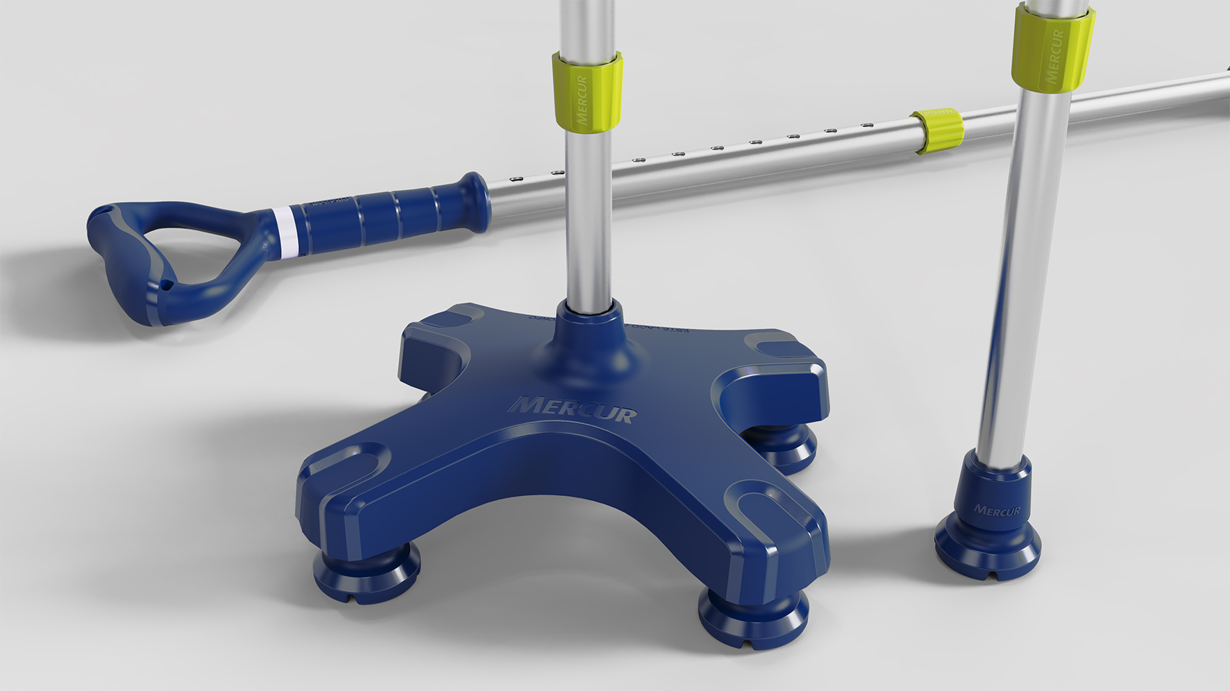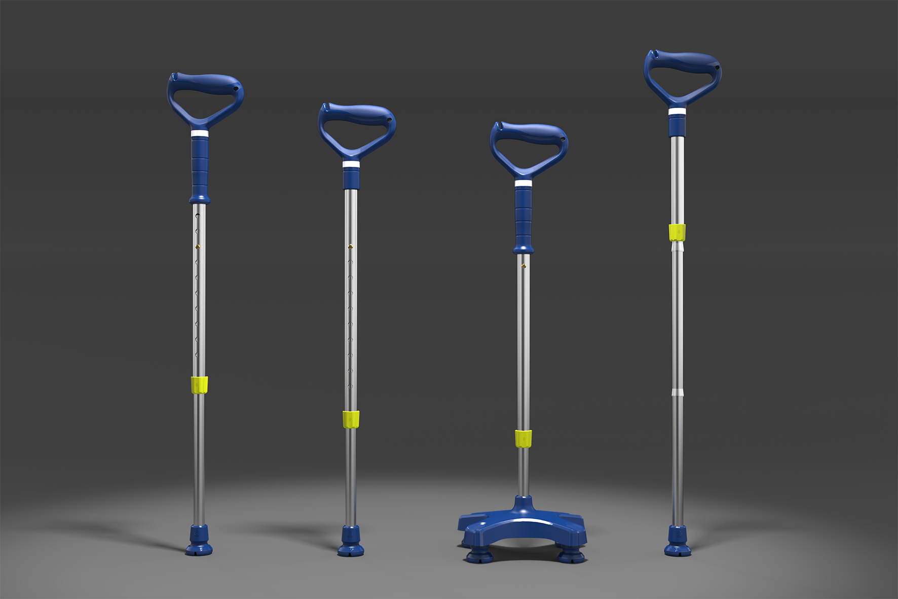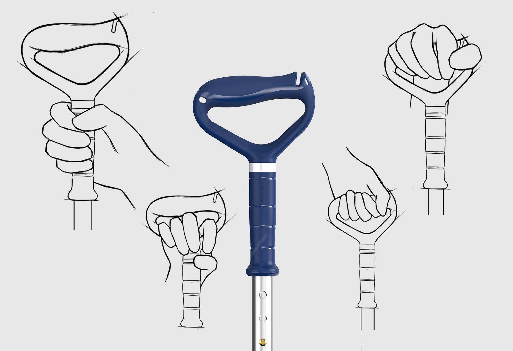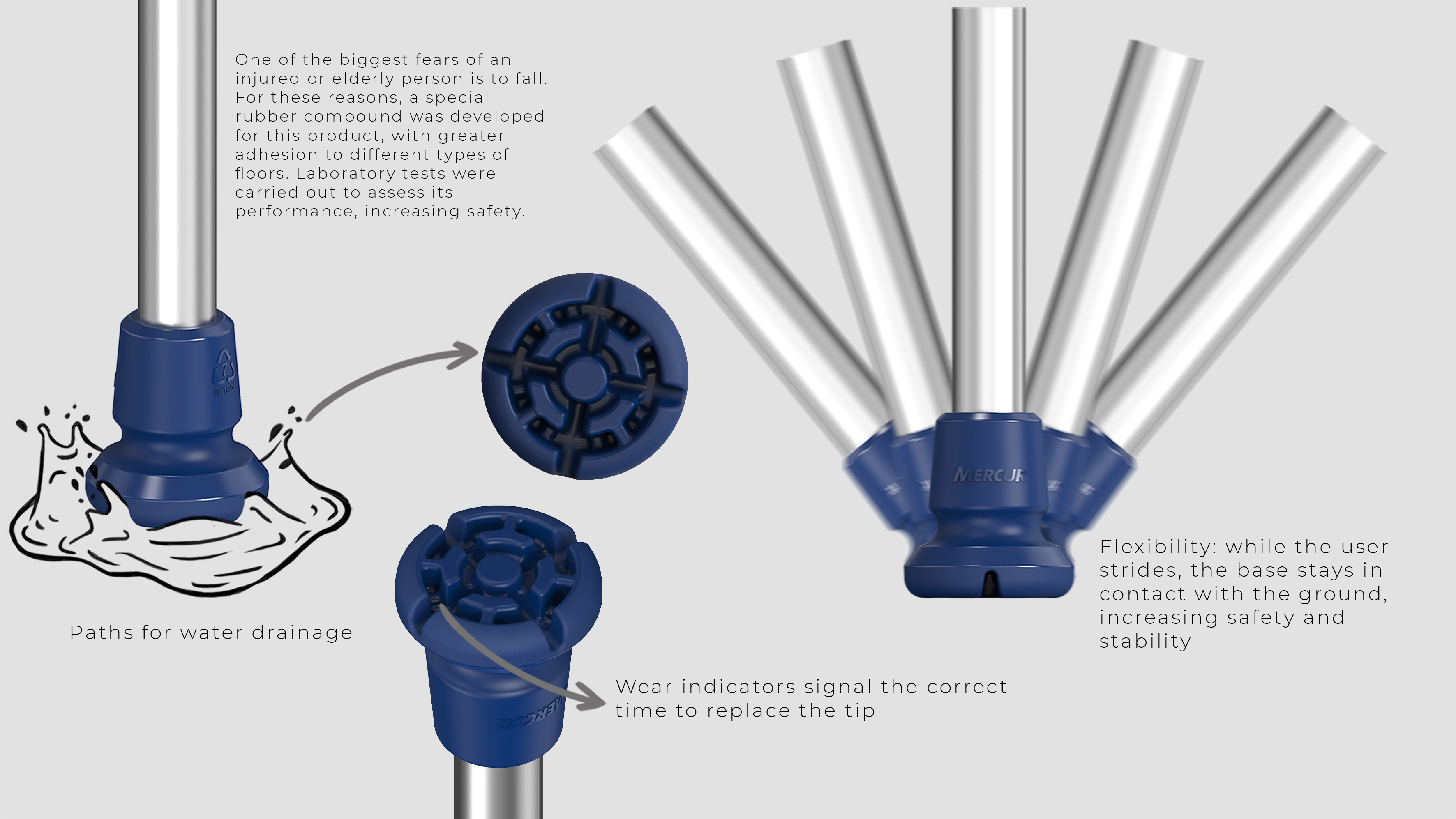 Listen responsibly to those who really need it and learn their needs. From these conversations we recreated the handle, now without splitting the fingers, increasing ergonomics and stability when walking. We added two more handles, aids for lifting and/or walking. A reflective tape was inserted with a 360° view for night walks. The front cutout helps transport objects. Laboratories indicated a rigid and light aluminum, helping the elderly with lower caloric expenditure in walking. The tip received rubber specially developed to adhere more to the ground, with an indication of replacement and water flow to avoid accidental falls. The 4-point PP tip model brought lightness and robustness.