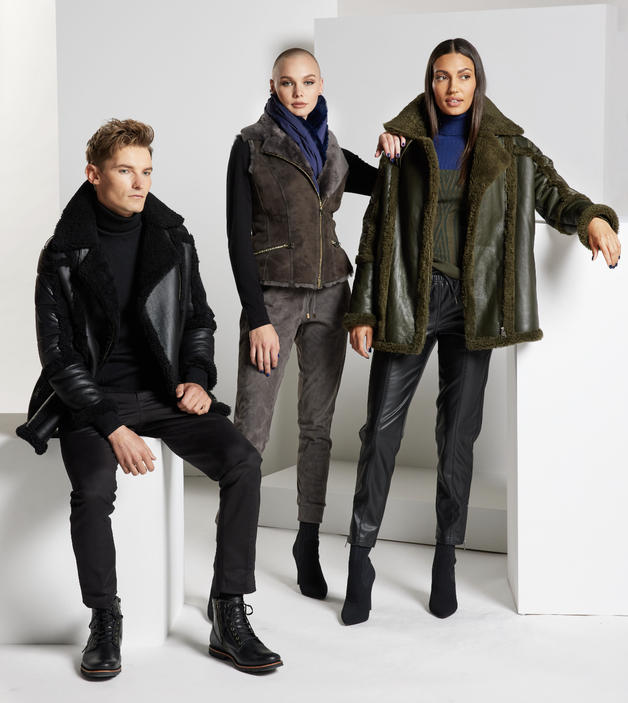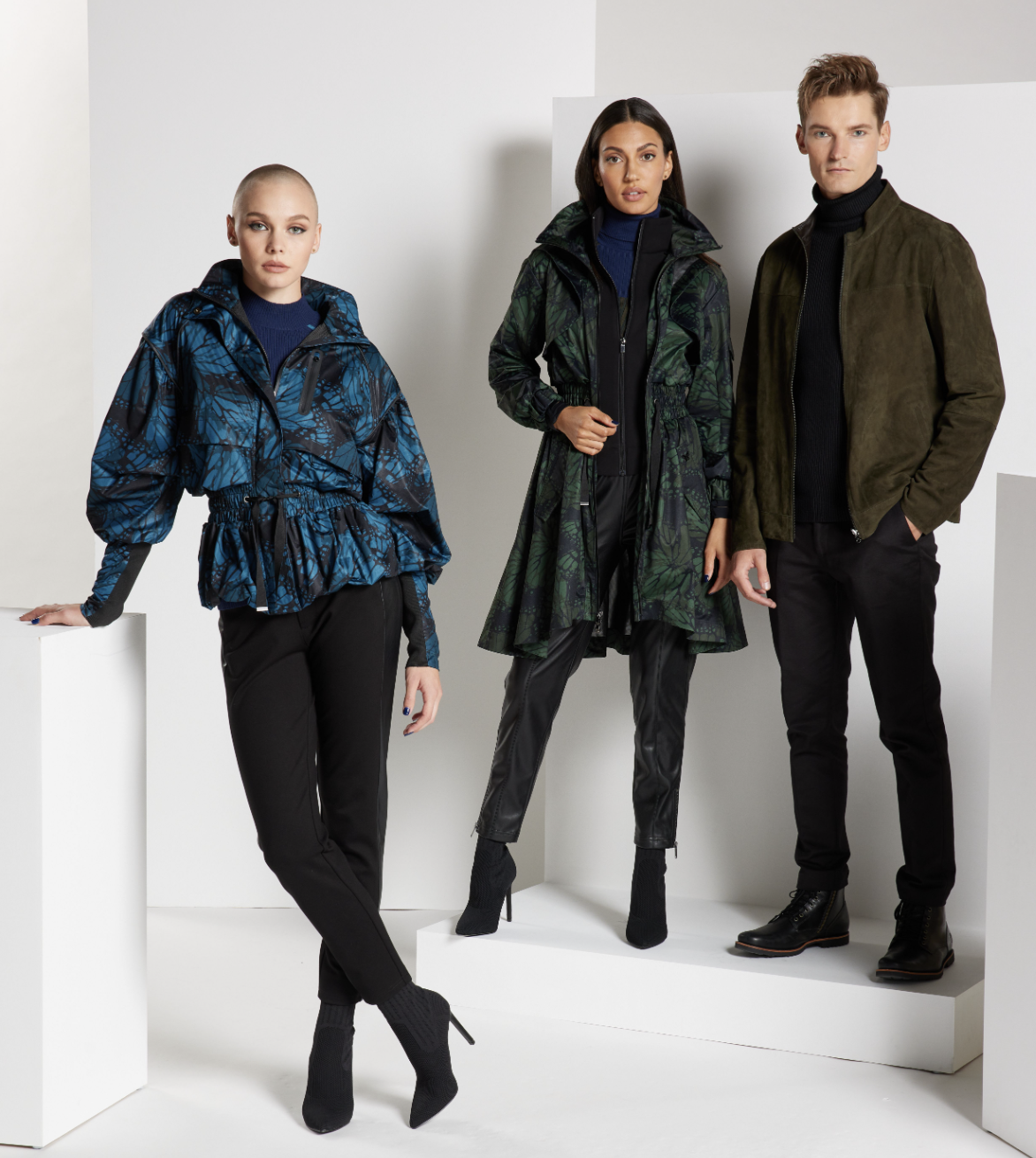 The designs feature waist-defining accents, angular seams and quilting, reflective trims, and a whole range of layers and jackets — from brushed jersey, bonded knits, and vegan leather to shearling, goose down, and suede — with a finale of rain jackets in Yang’s signature Monarch print.