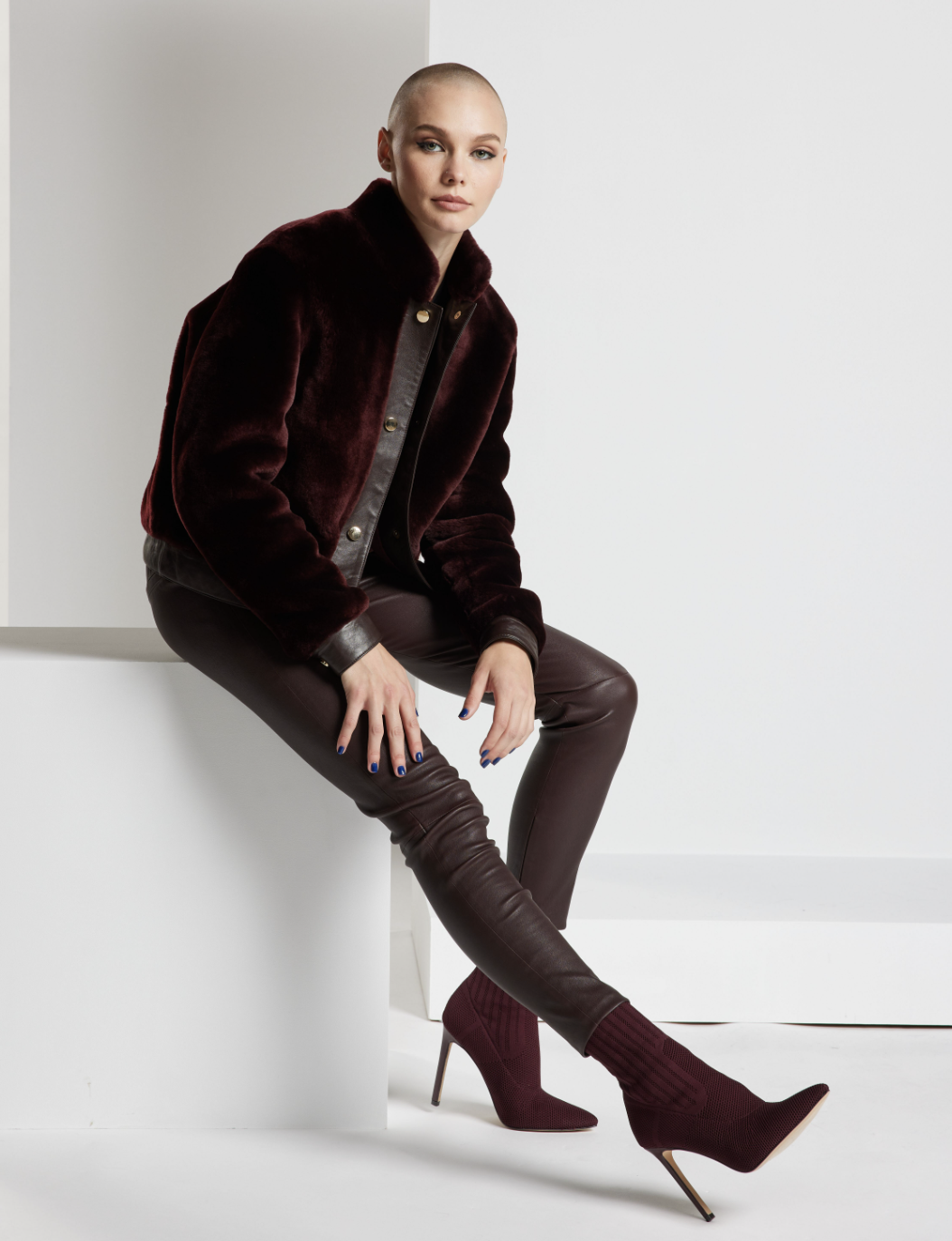 Zoom Bonded Knit Jacket: (a cheeky nod to the new norm of virtual meetings) Biker jacket with sculptural collar, featuring angled seaming, mesh inserts, and quilted contoured accents.