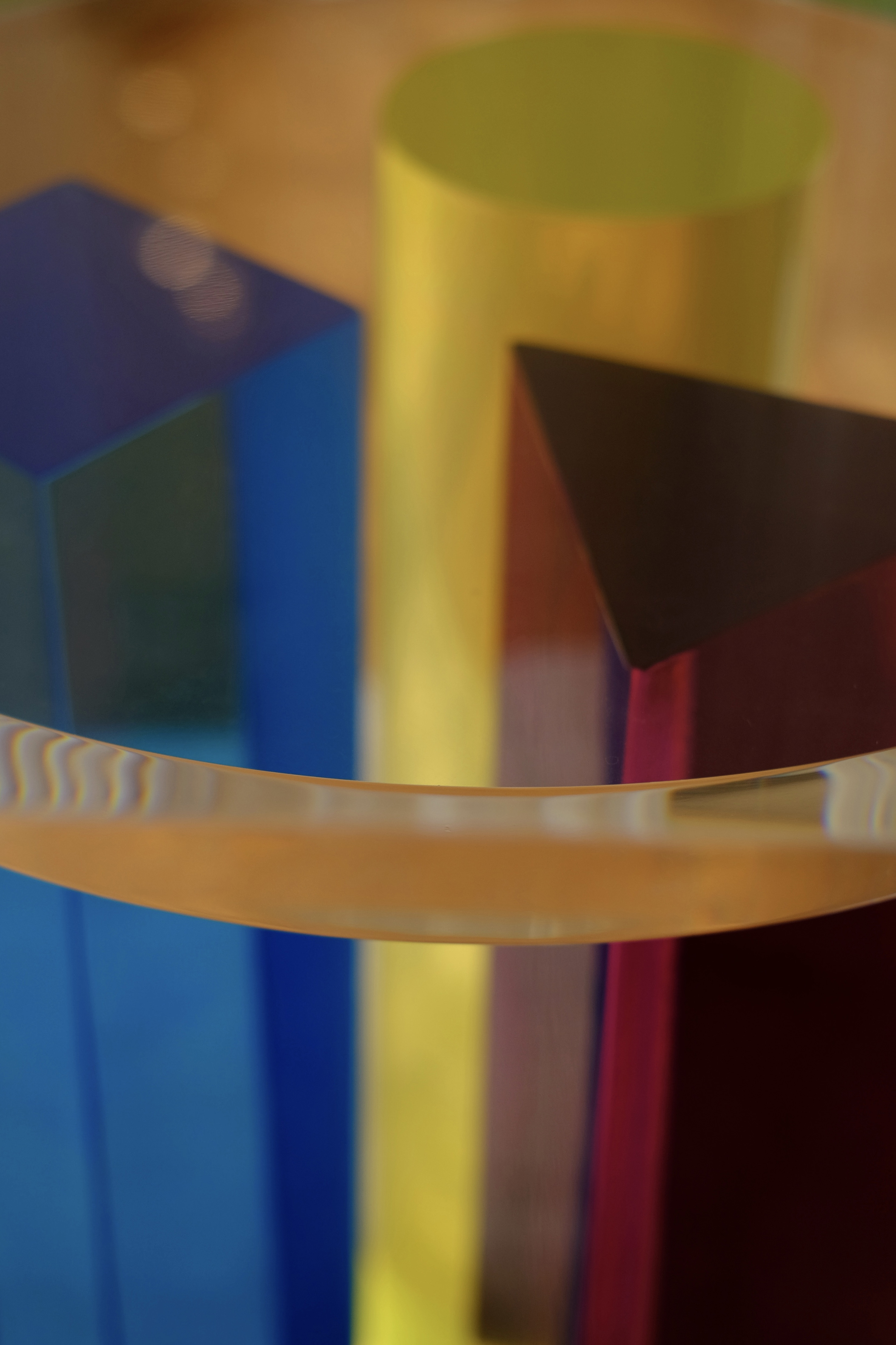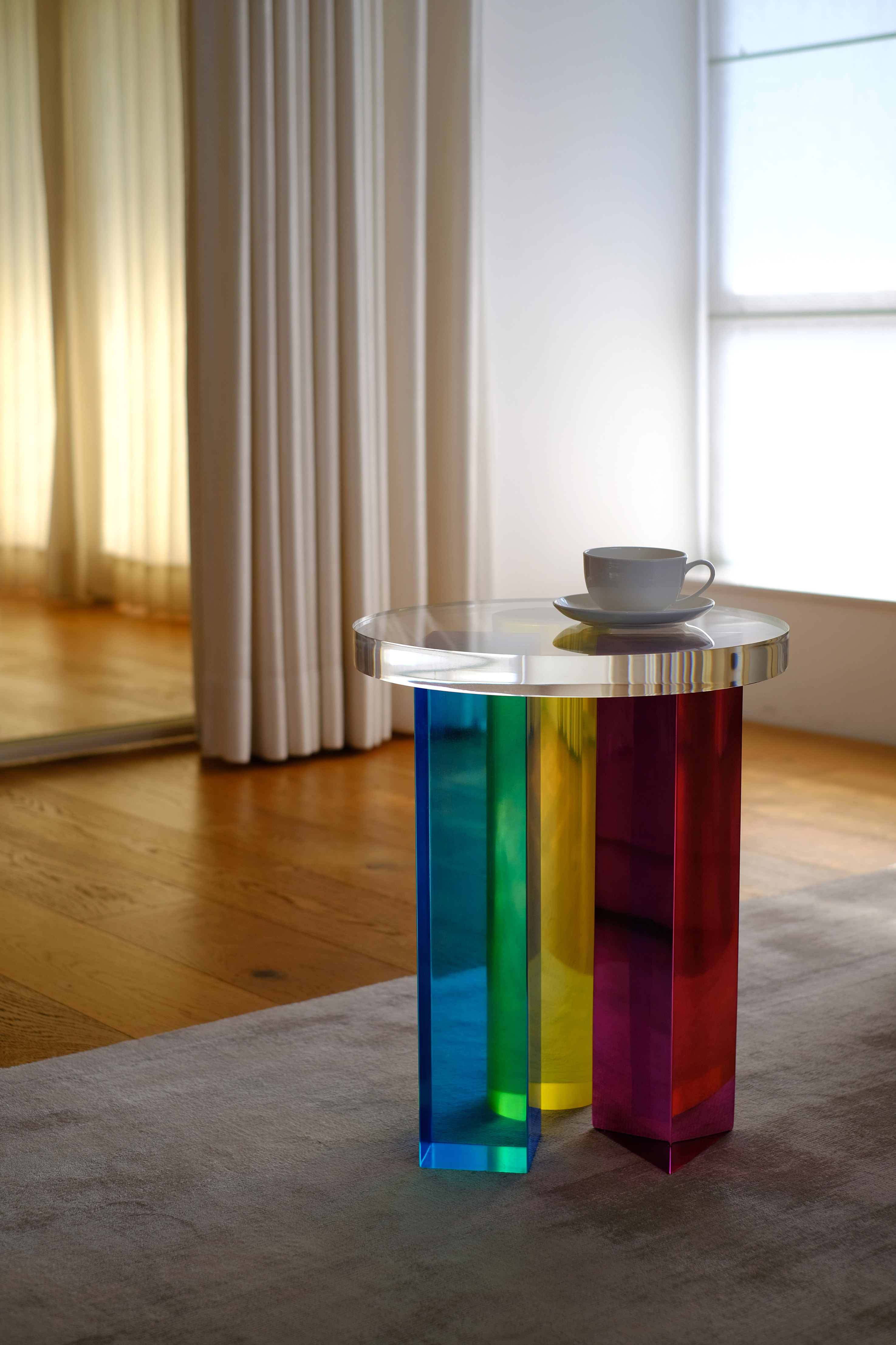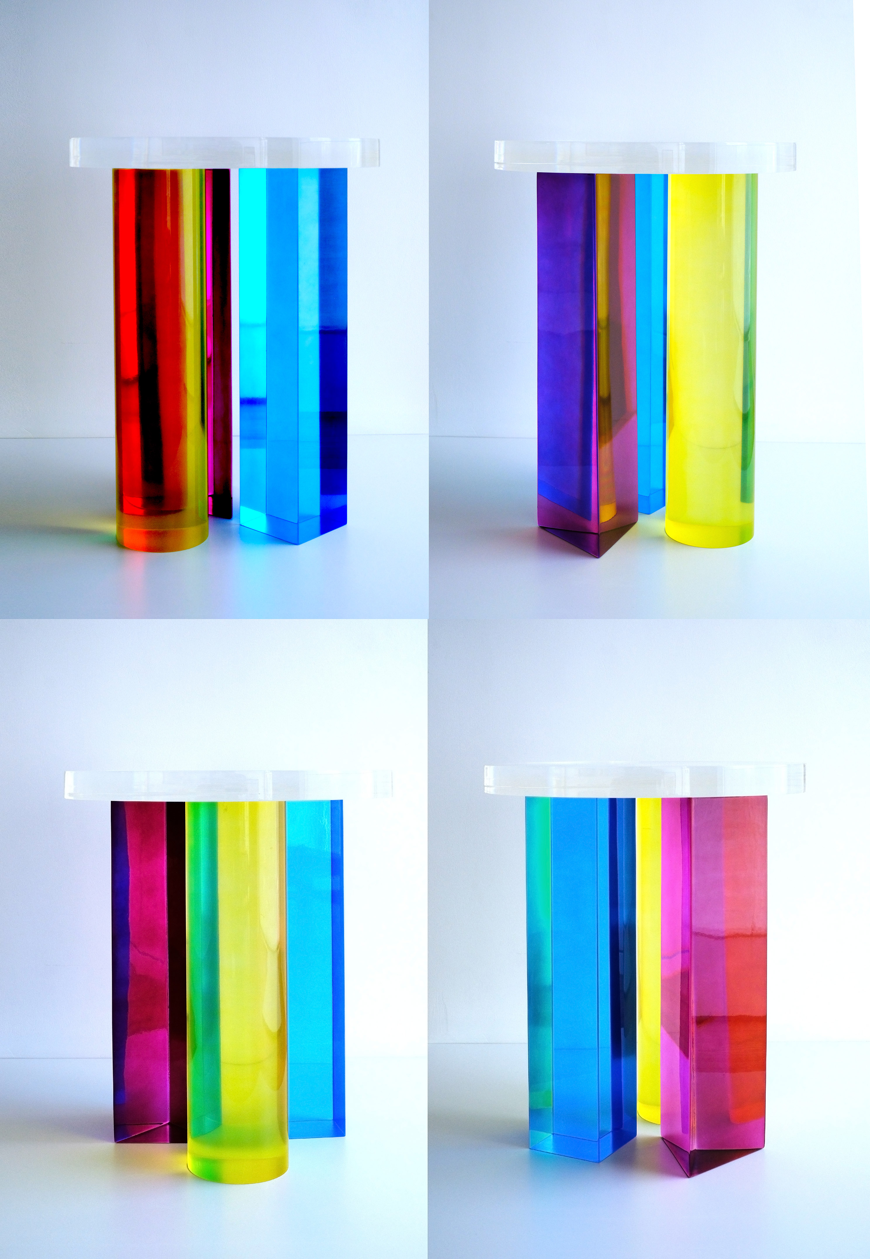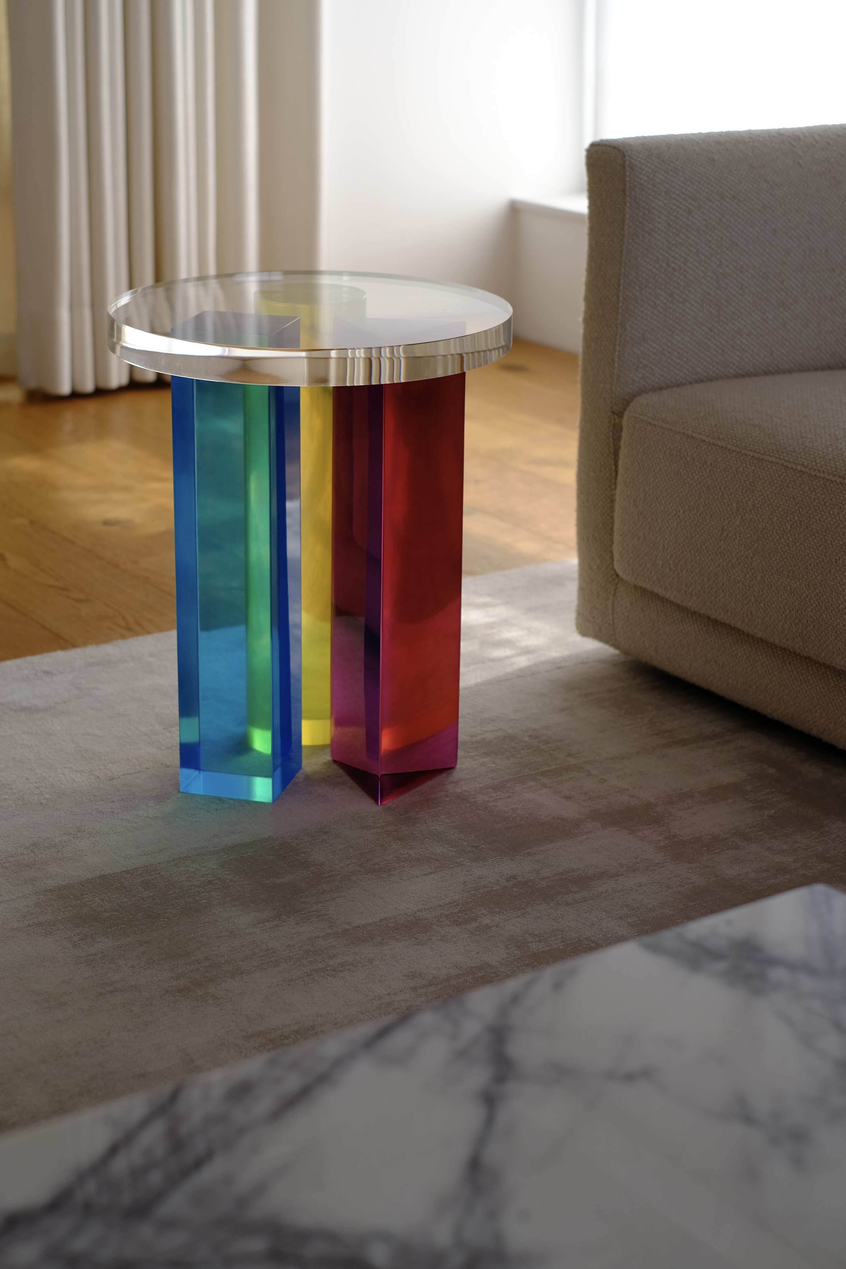 As the name implies, this coffee table is made of three primary colours, and through the translucency of the acrylic material itself, the colours collide and refract with the light when it is transmitted through the product, causing the three primary colours to overlap and change, presenting different colour variations. The table measures 400mm X 400mm X 480mm and is made of acrylic. With the different colours of each table leg, it gives a different visual experience of colour when the product is viewed from different perspectives, due to the different layers of superimposition and the different refractive surfaces.