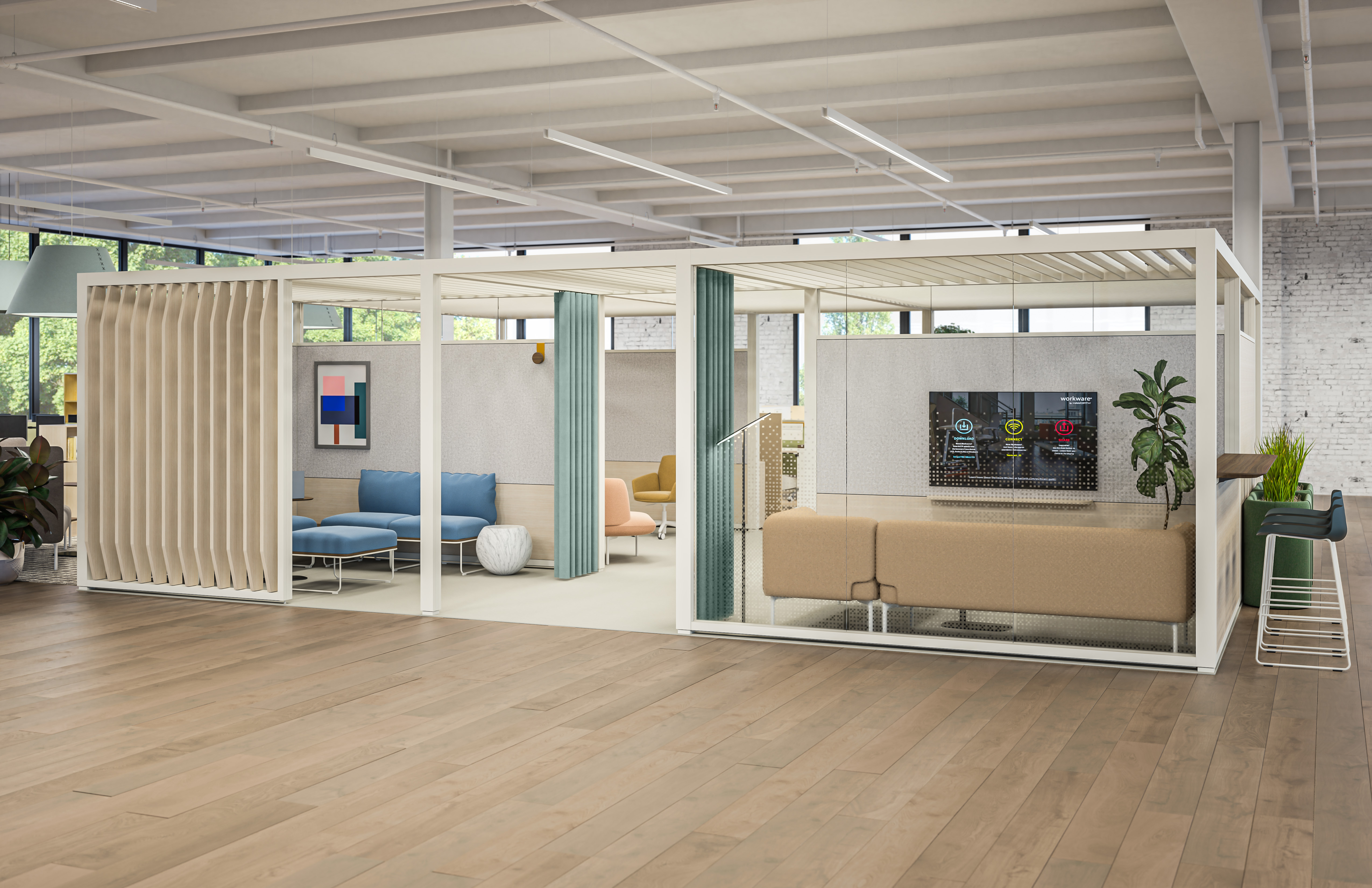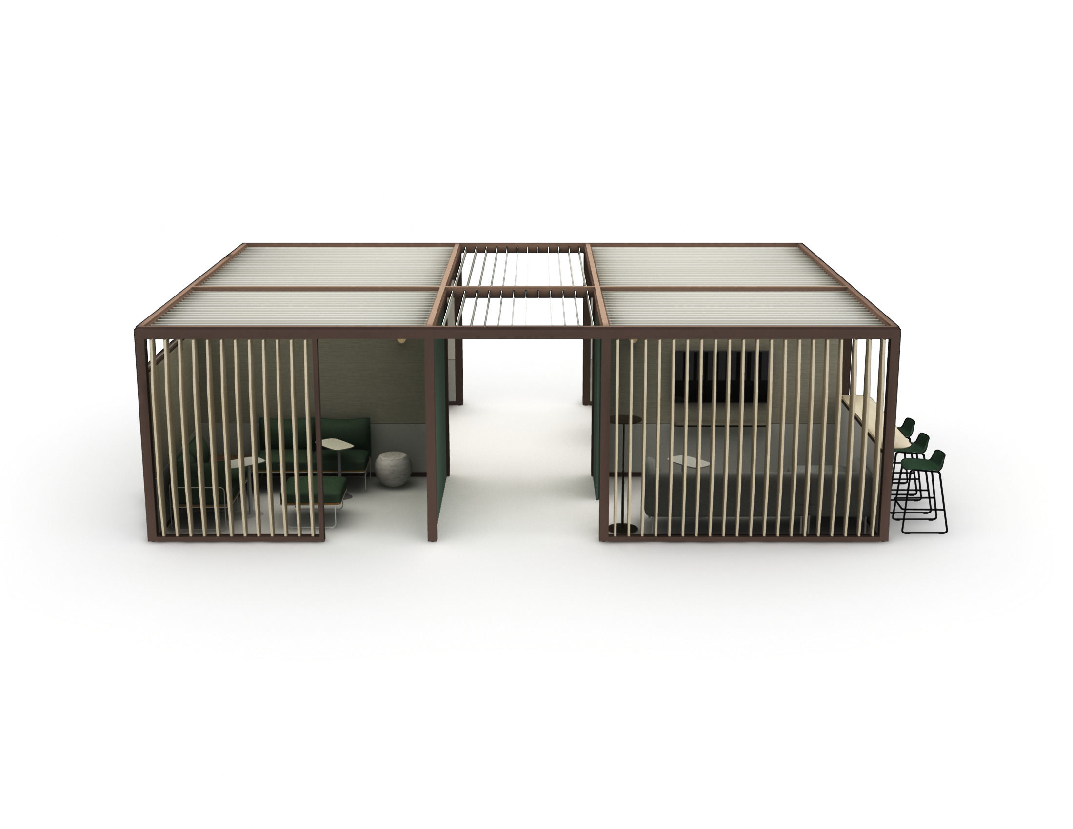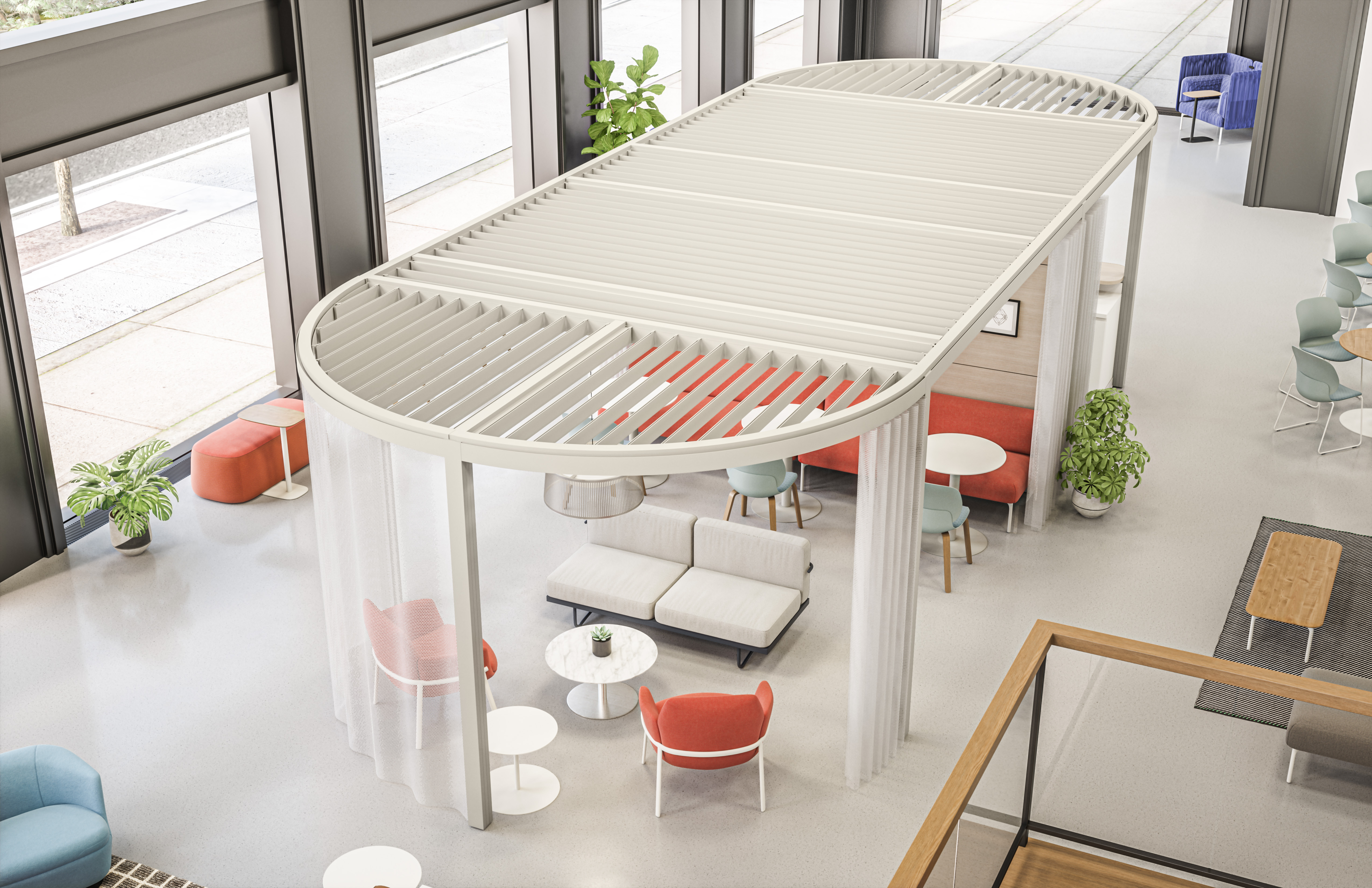 Pergola is a free-standing architectural workspace where people can get away to connect, collaborate or focus. Its simplest description is a room-within-a-room. Offering a broad range of space and room solutions that are scalable in size, sound absorption and visual privacy, Pergola has a spectrum of functional and aesthetic options, as well as applications from simple post and beam to semi enclosed rooms that can be ganged together.