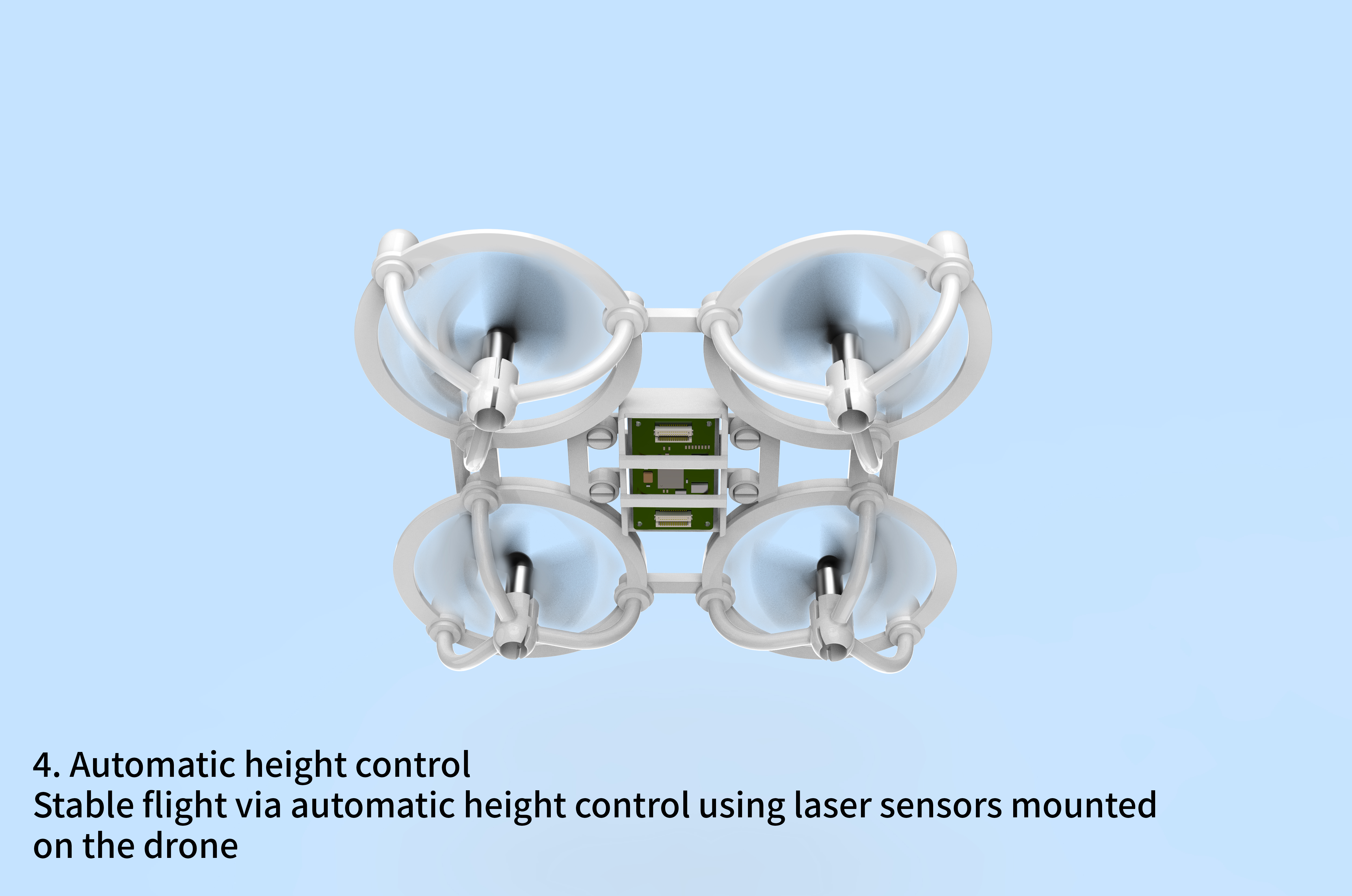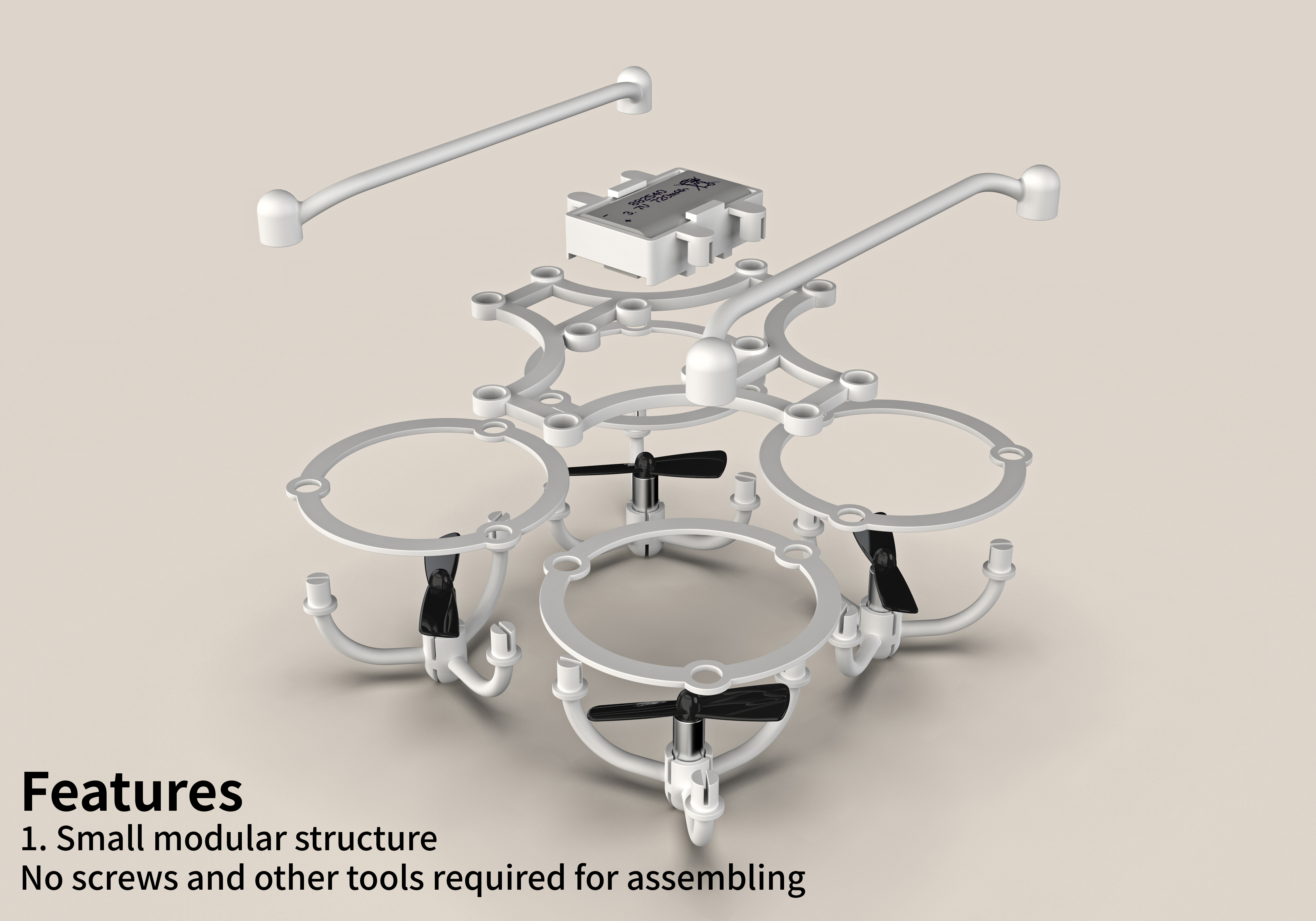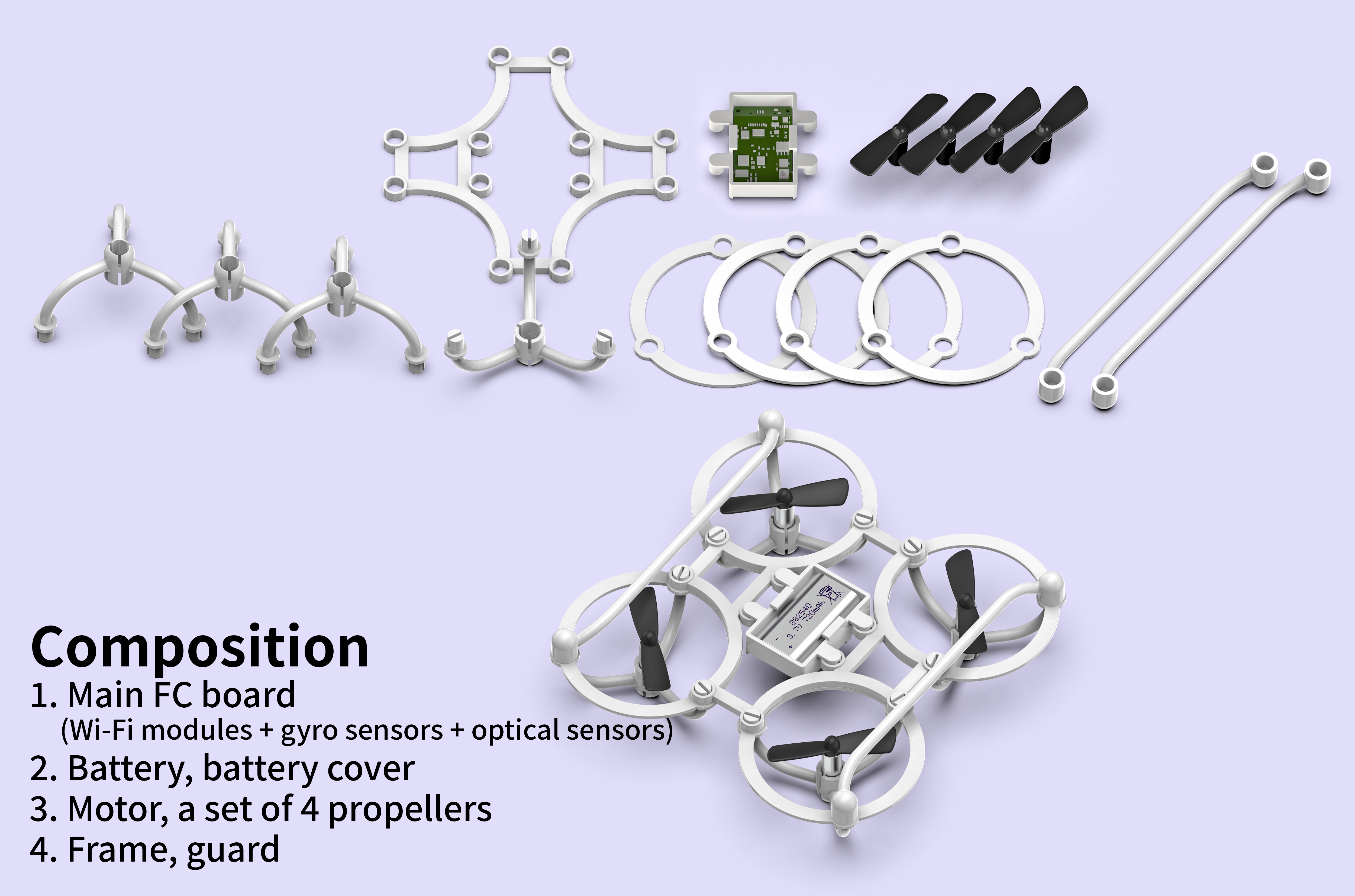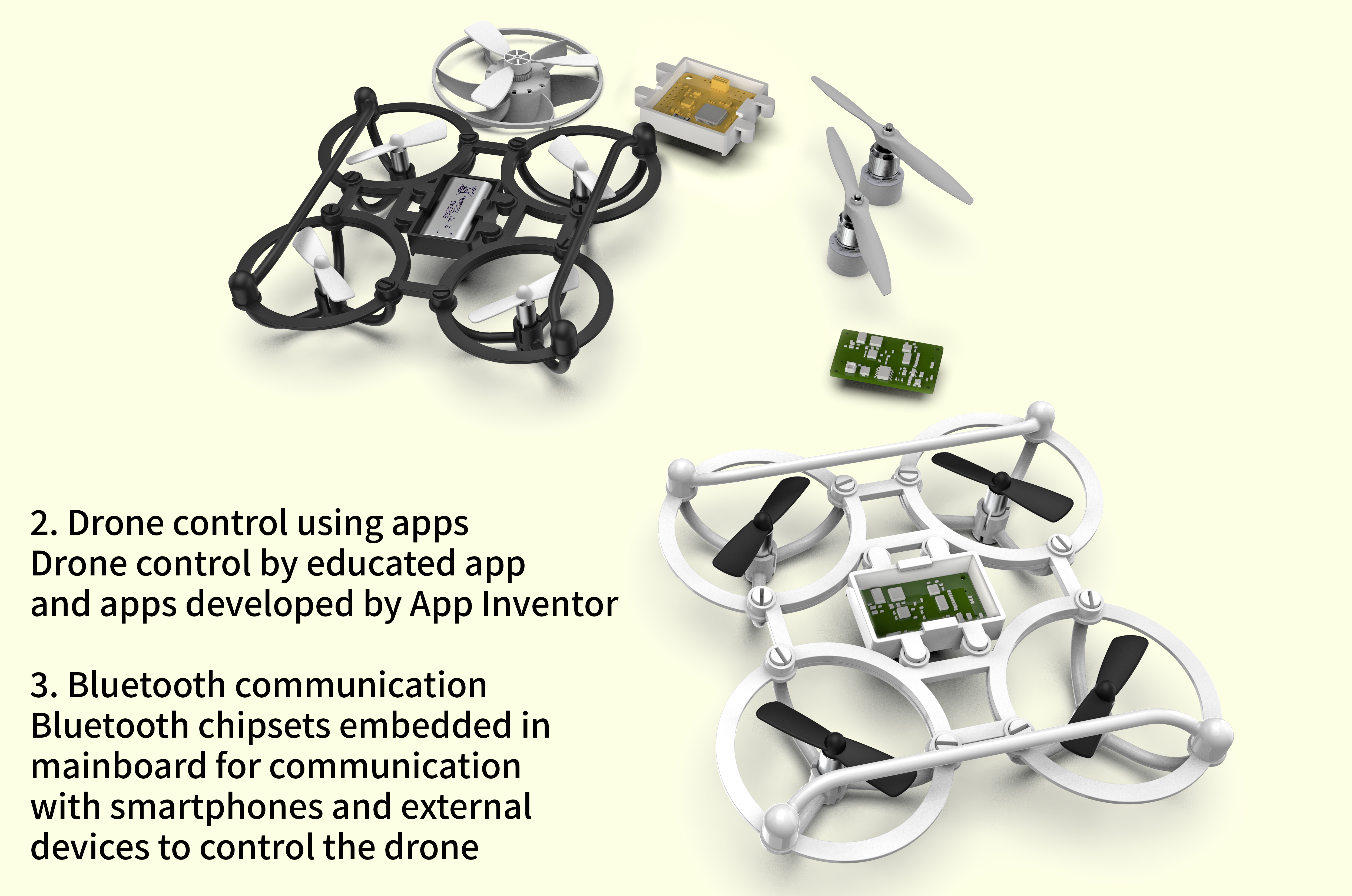 This is a DIY drone for educational purpose to help students with basic understanding of drones, their working principles and applications. Students will be able to learn and write codes on their PC, and also use a dedicated app and other applications to control this drone which was developed for STEM education. Each component can be easily assembled and disassembled without separate tools, and users can assemble the parts any way they want. Additional components such as Arduino board, IR sensor and modules can be added, and parts replacement and reassembling are allowed.