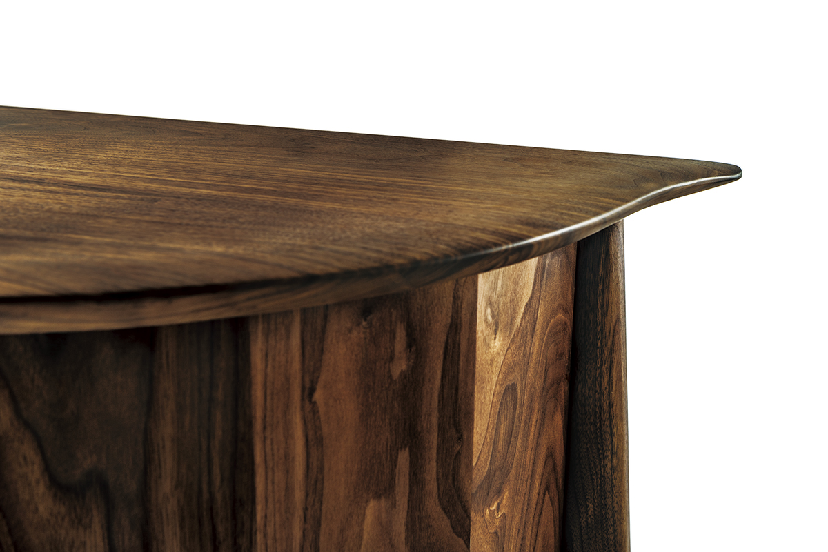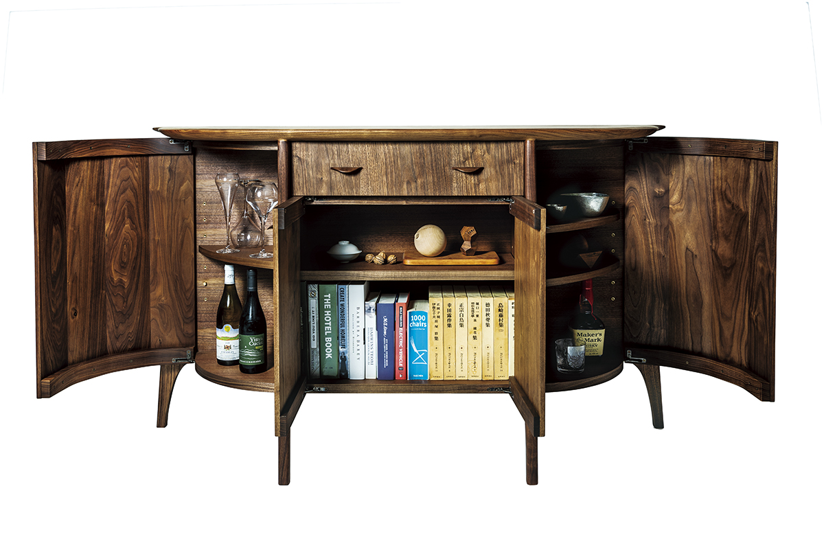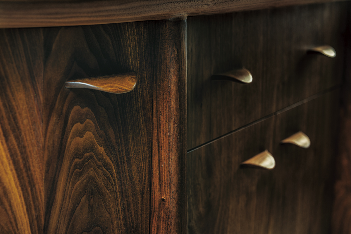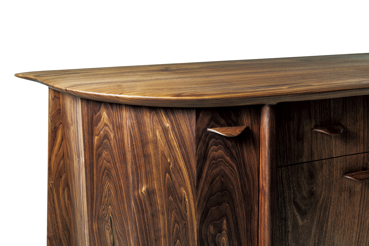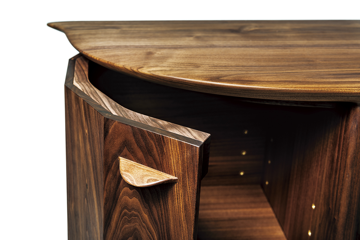 The doors, which are made of solid wood joined at an angle to form a rounded shape, are finished not with the smooth circles of molded plywood, but with corners that are unique to solid wood, creating a three-dimensional shadow that accents the entire piece of furniture. The handles are then embedded.