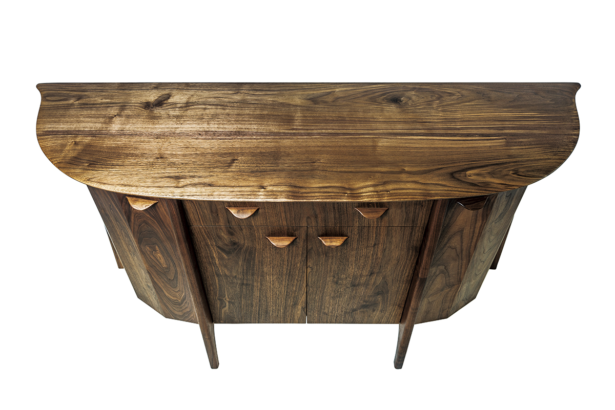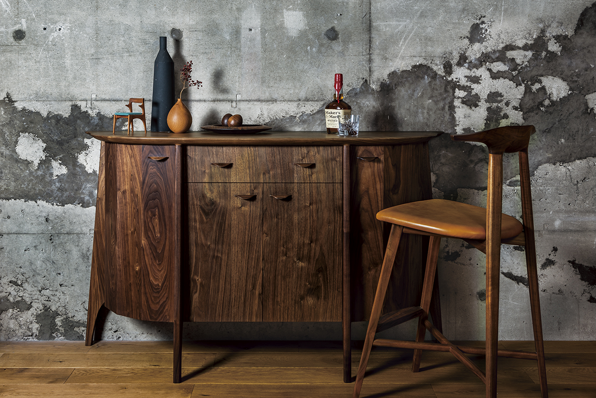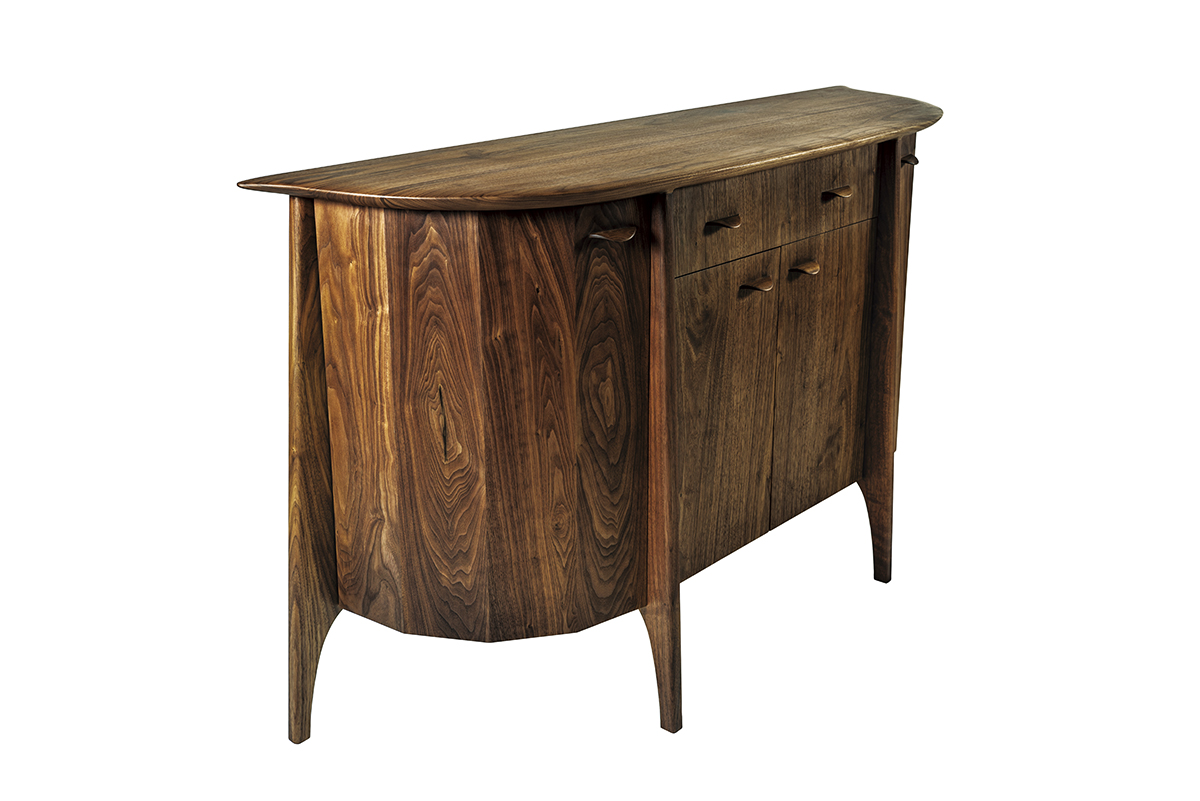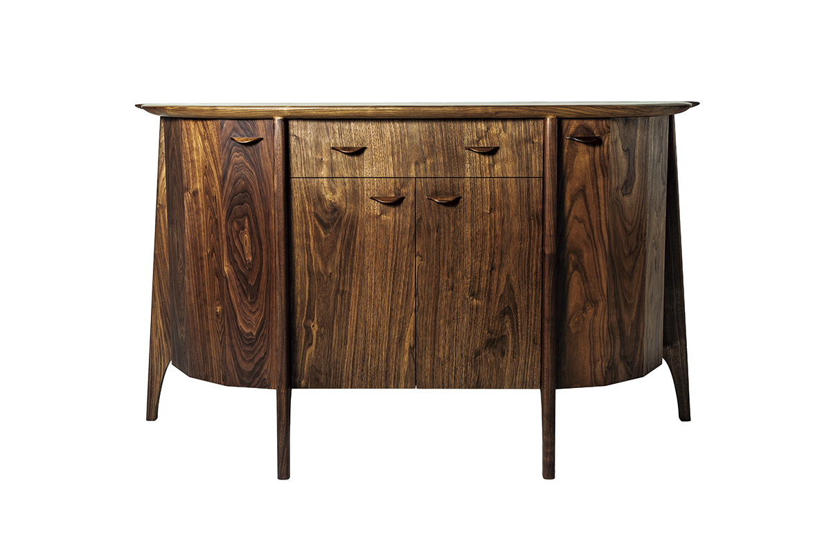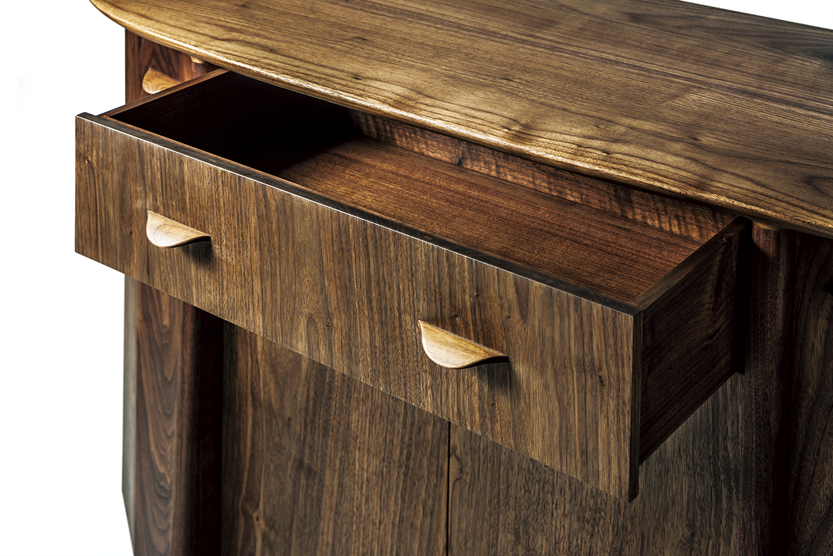 The doors, which are made of solid wood joined at an angle to form a rounded shape, are finished not with the smooth circles of molded plywood, but with corners that are unique to solid wood, creating a three-dimensional shadow that accents the entire piece of furniture. The handles are then embedded.