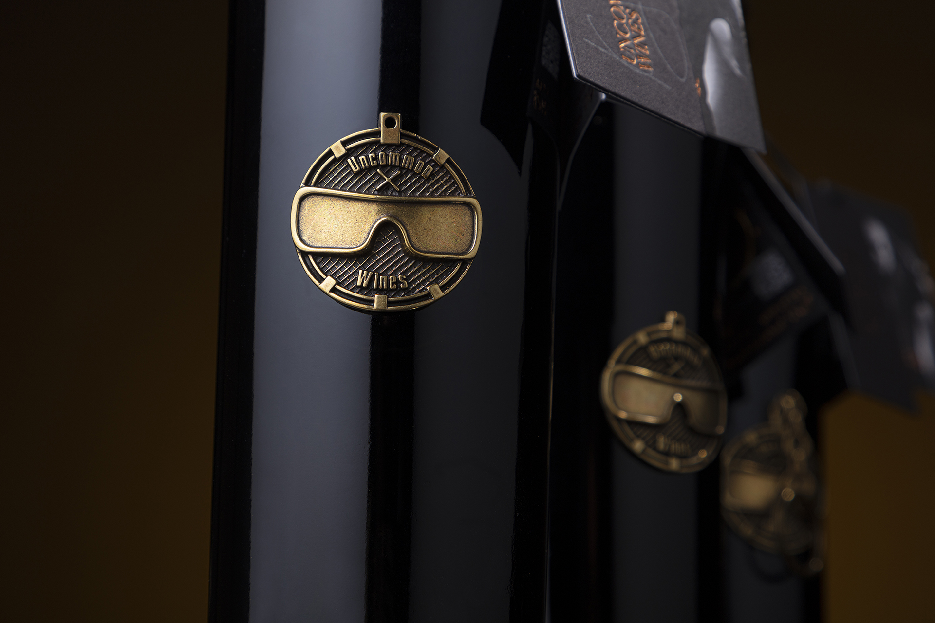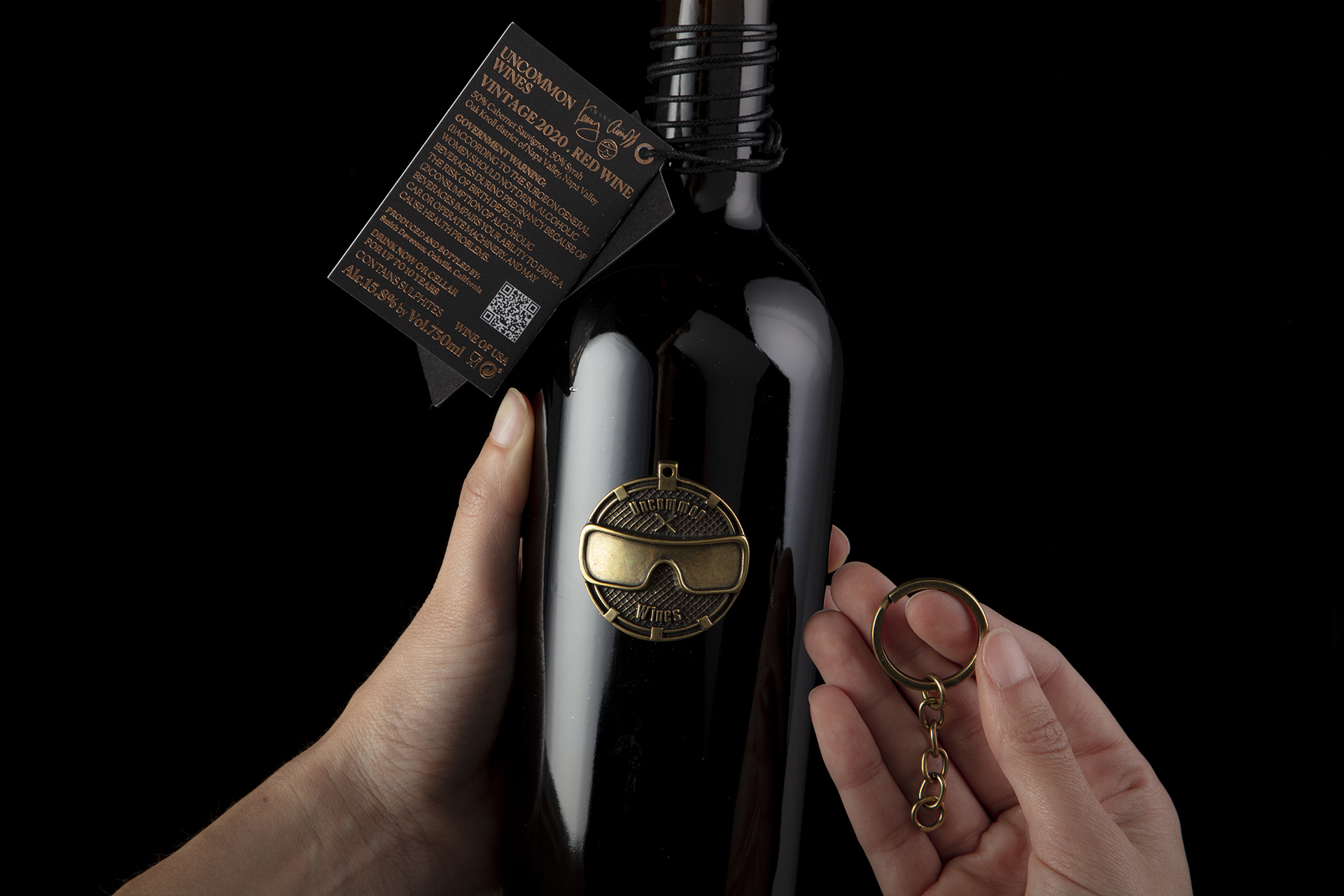 A truly genius design possessing an ethereal and timeless beauty surrounded by mystery that makes the consumer stop, think, look, and want to own a bottle of Uncommon Wines. Keeping sustainability in mind, the packaging is 100% recyclable, the stunning medallion can be removed after finishing the wine and it turns into a keychain after (the chain is attached to the tags on the neck).