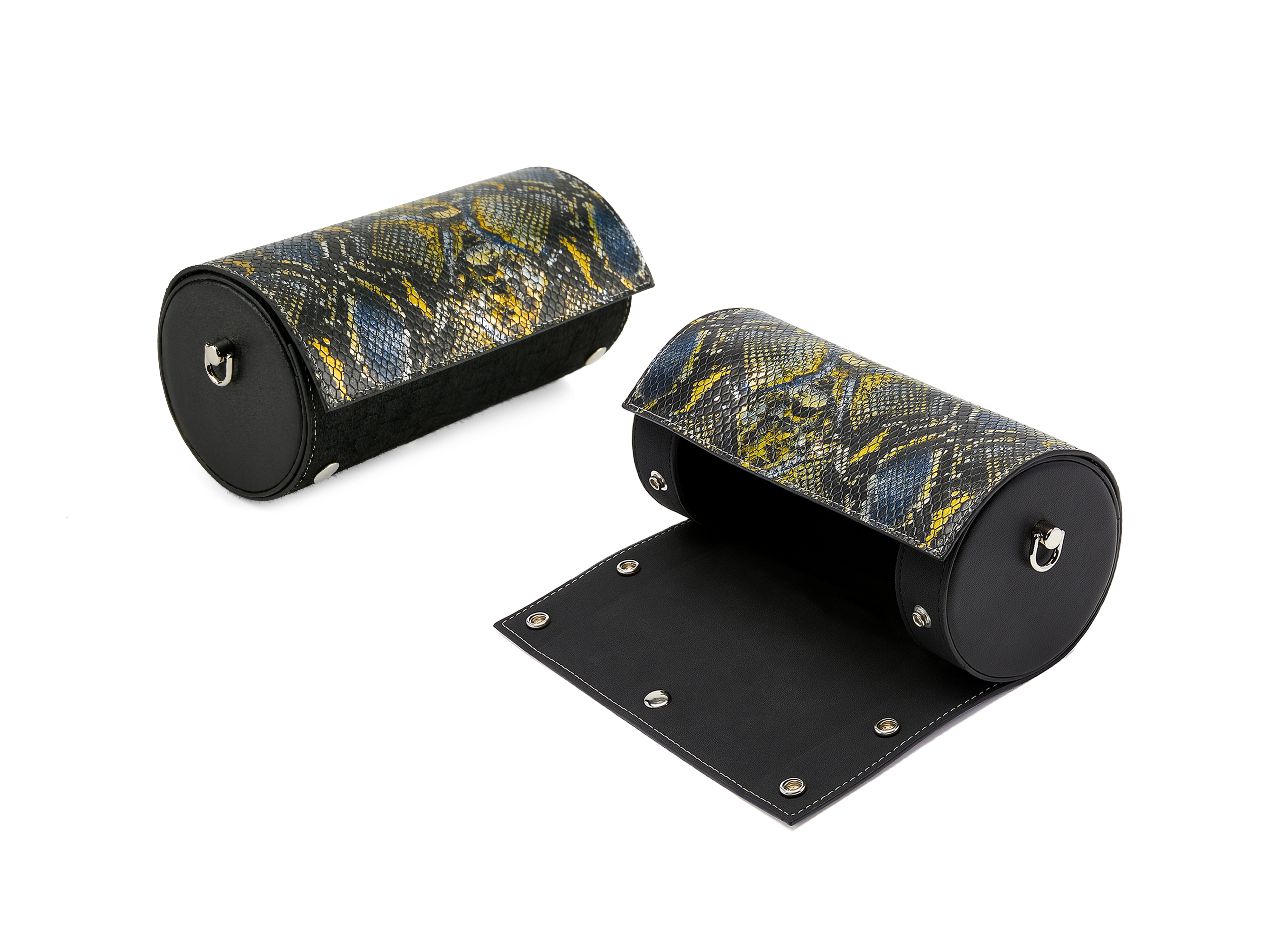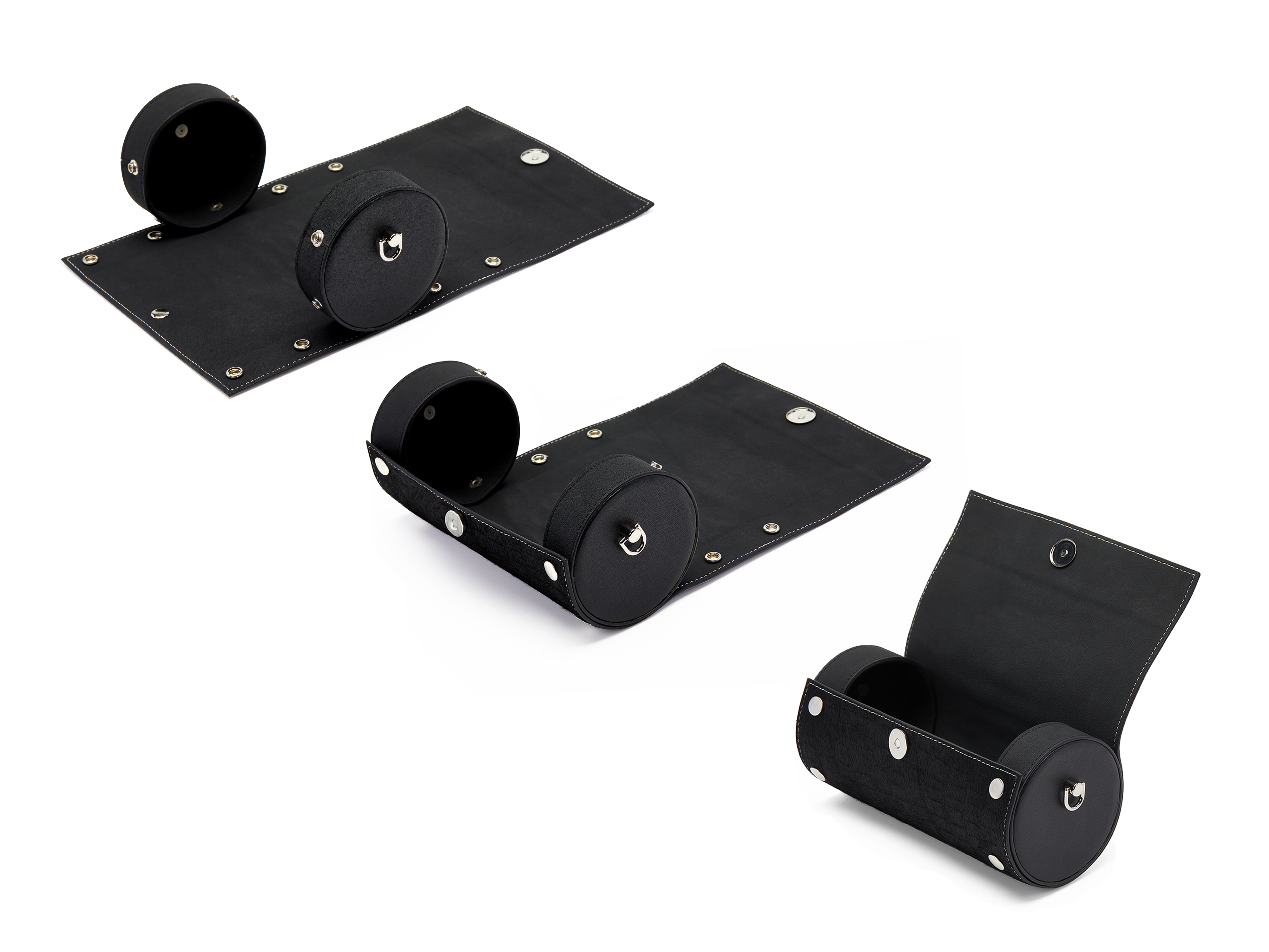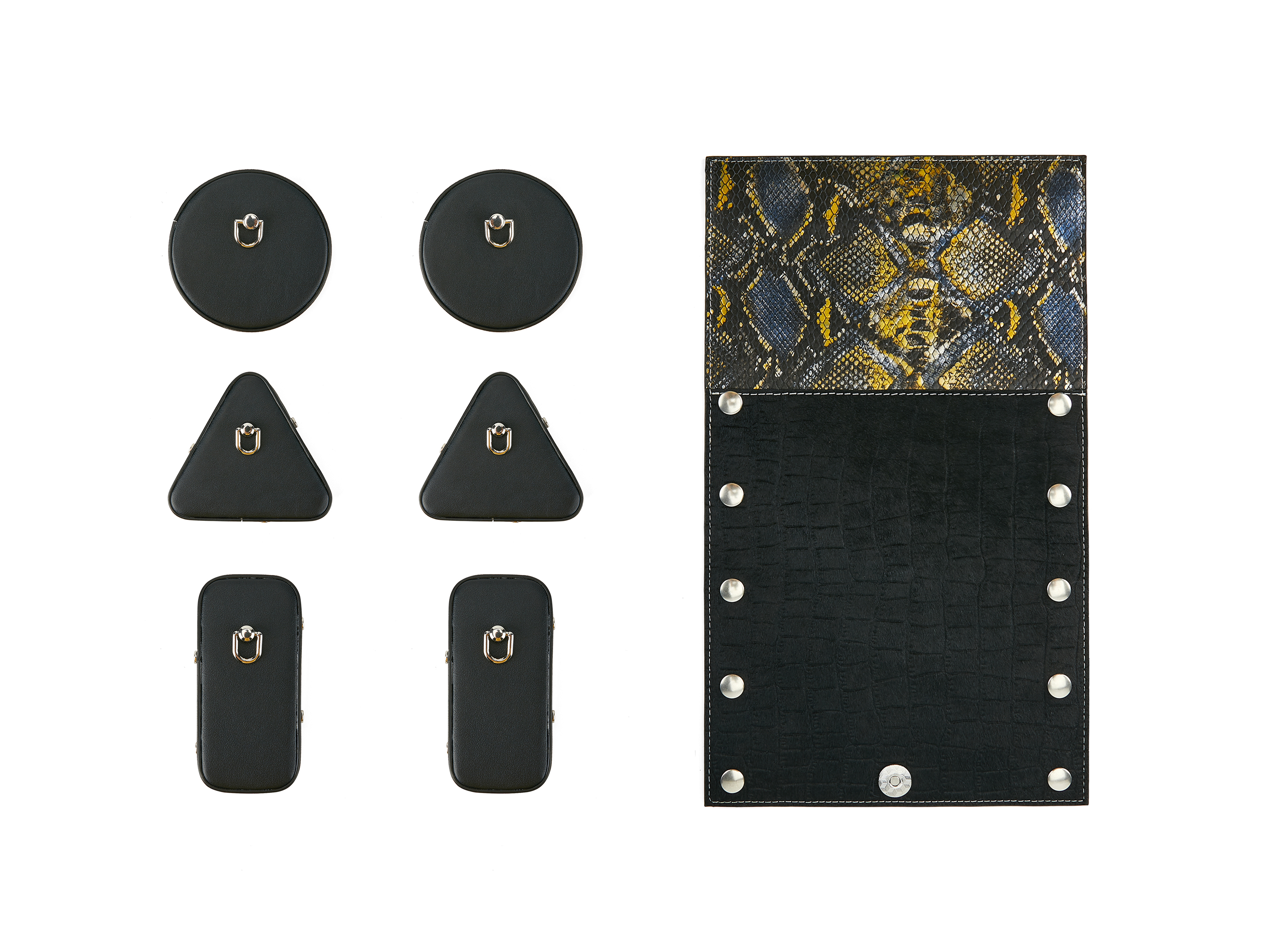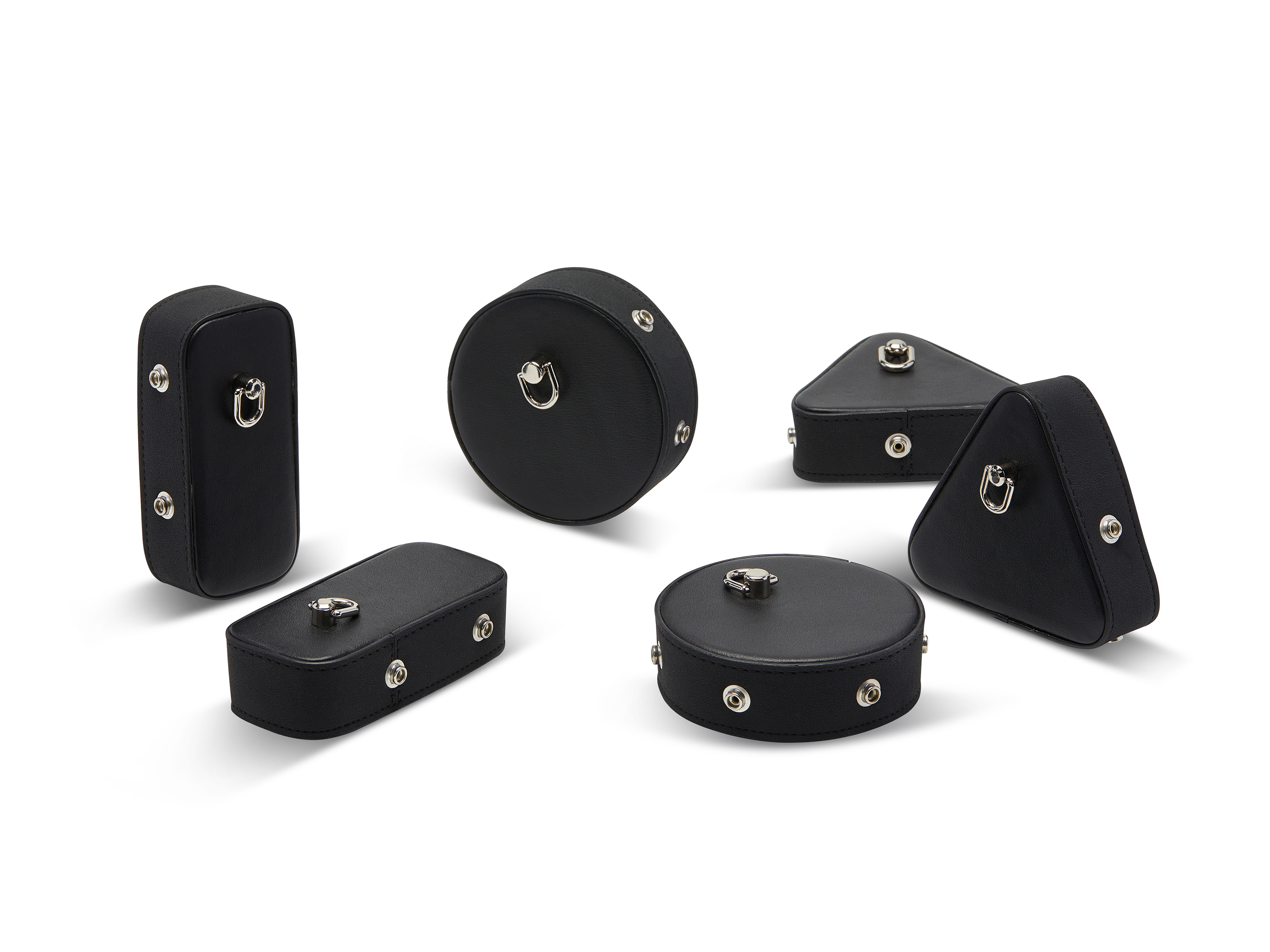 The bag ears come in circular, triangular, and rectangular shape. Depending on which pair of ears the sheet assembles with, the bag can turn into a cylinder, a prism, or a cuboid.