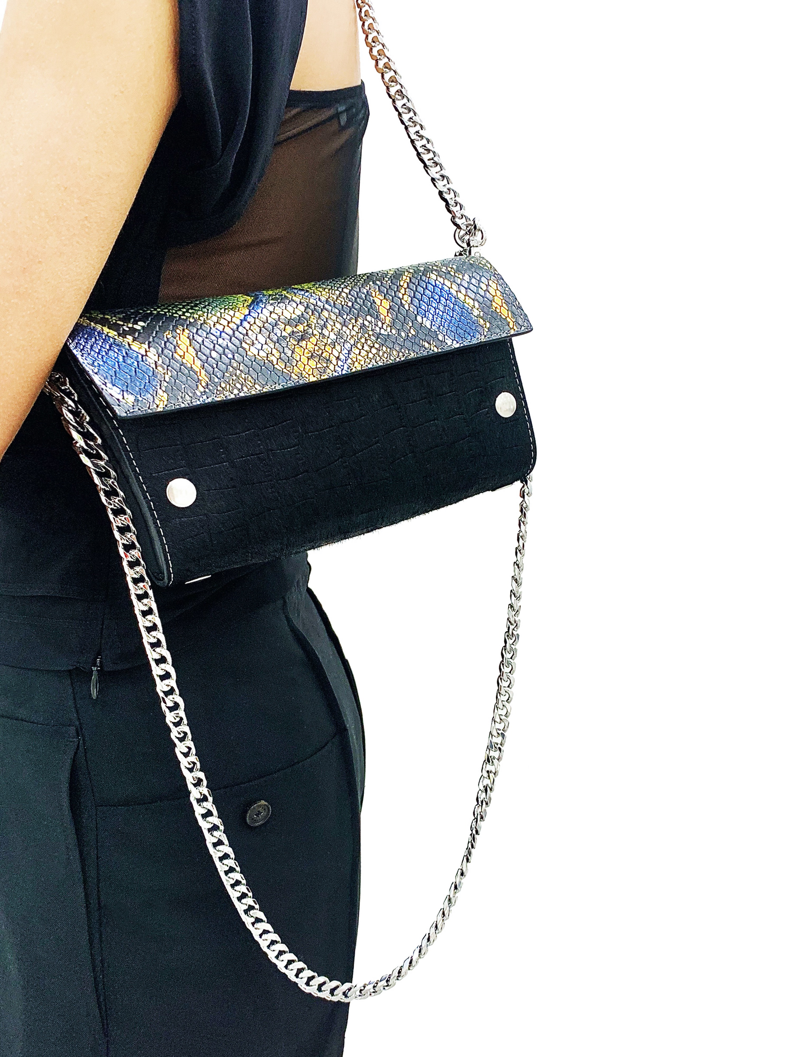 Both the sheet and the bag ears are mounted with snap buttons, which allows for fastening and unfastening during bag assembly. Pull-ring rivets on the side of the ears are to connect a detachable chain shoulder strap.