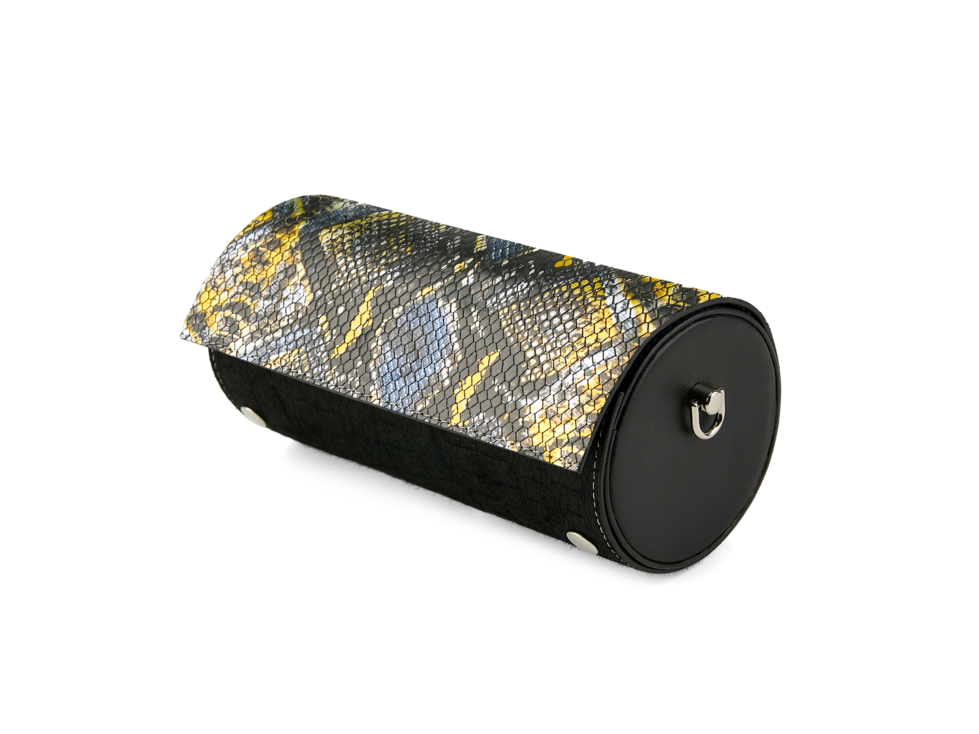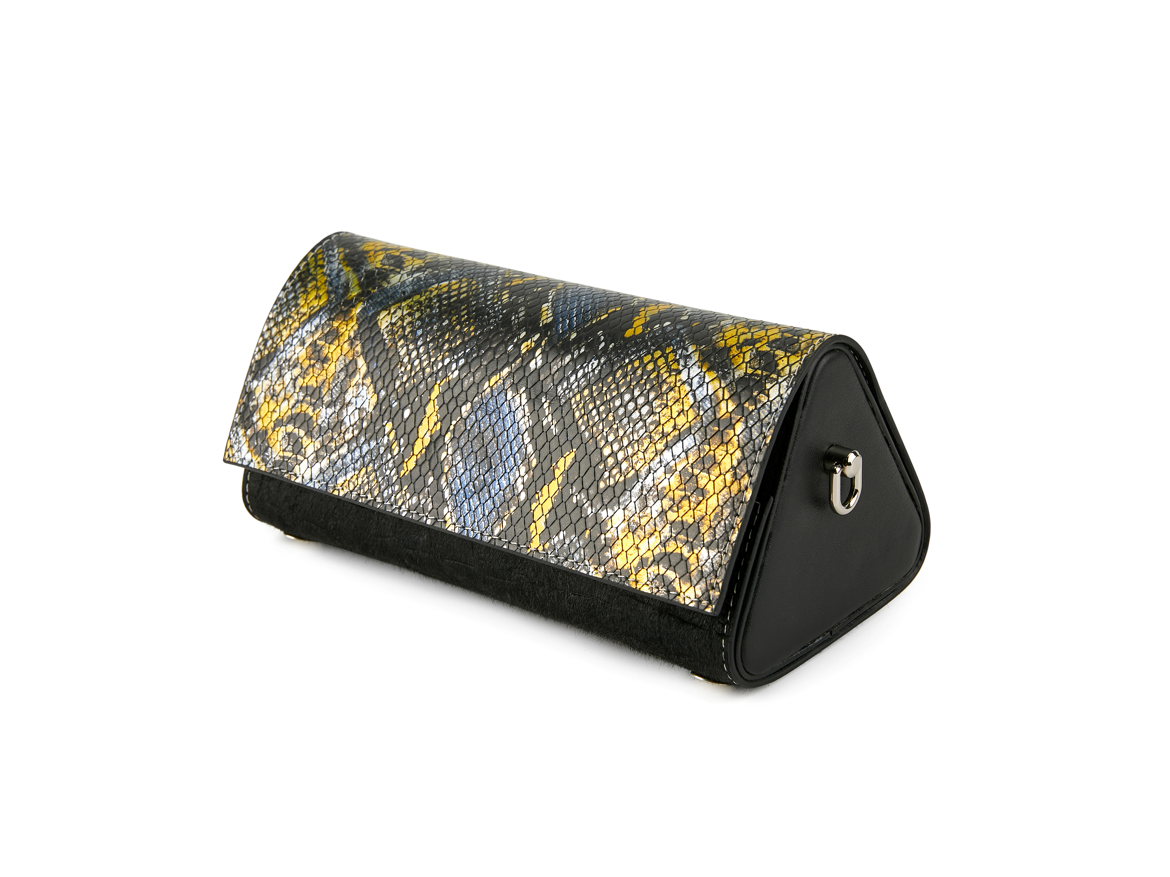 Kaleidoscope Bag is an interactive handbag that can transform into different geometrical shapes. The bag is consisted of one sheet of leather and three pairs of "bag ears". By assembling the sheet with different pairs of bag ears, the bag's overall shape is changed.