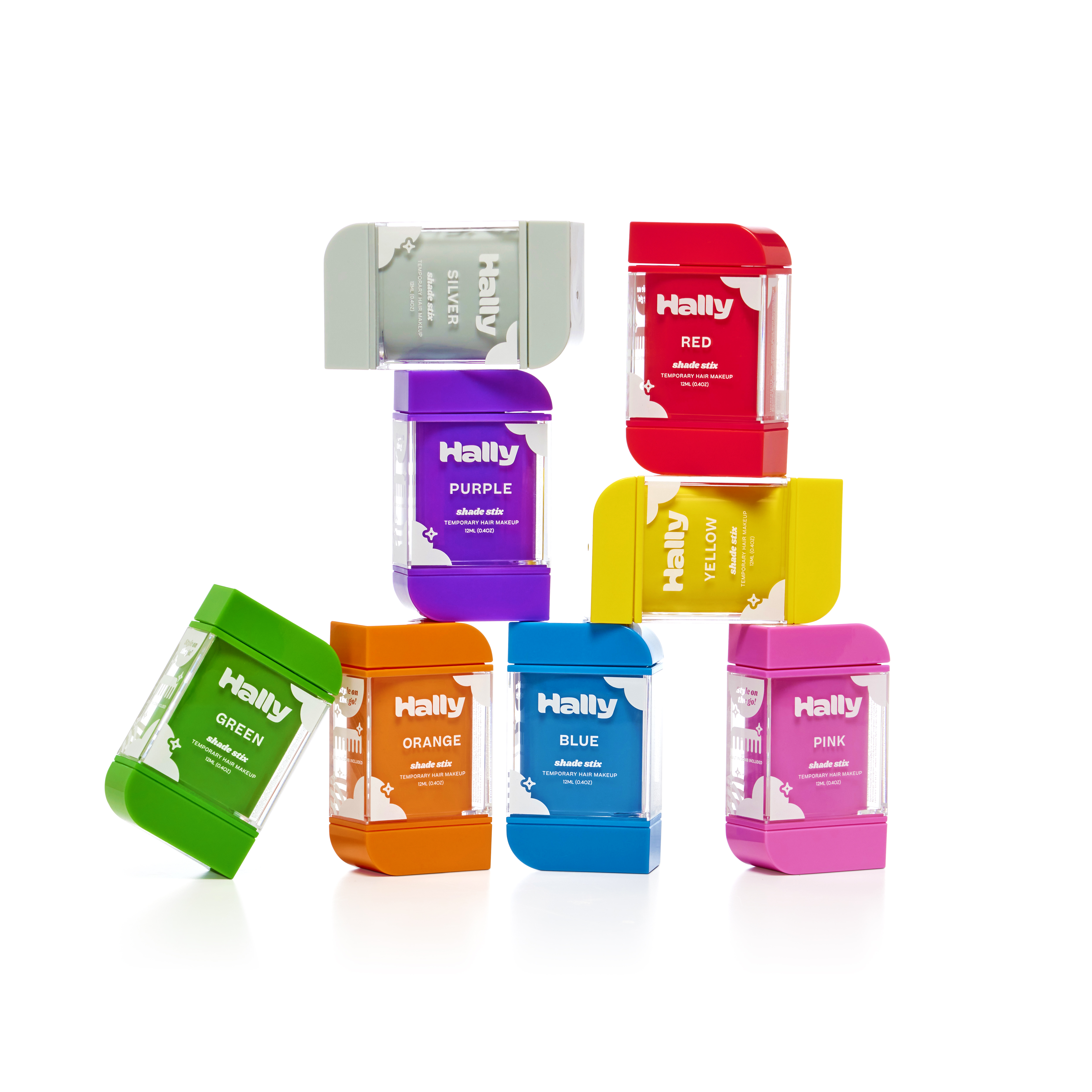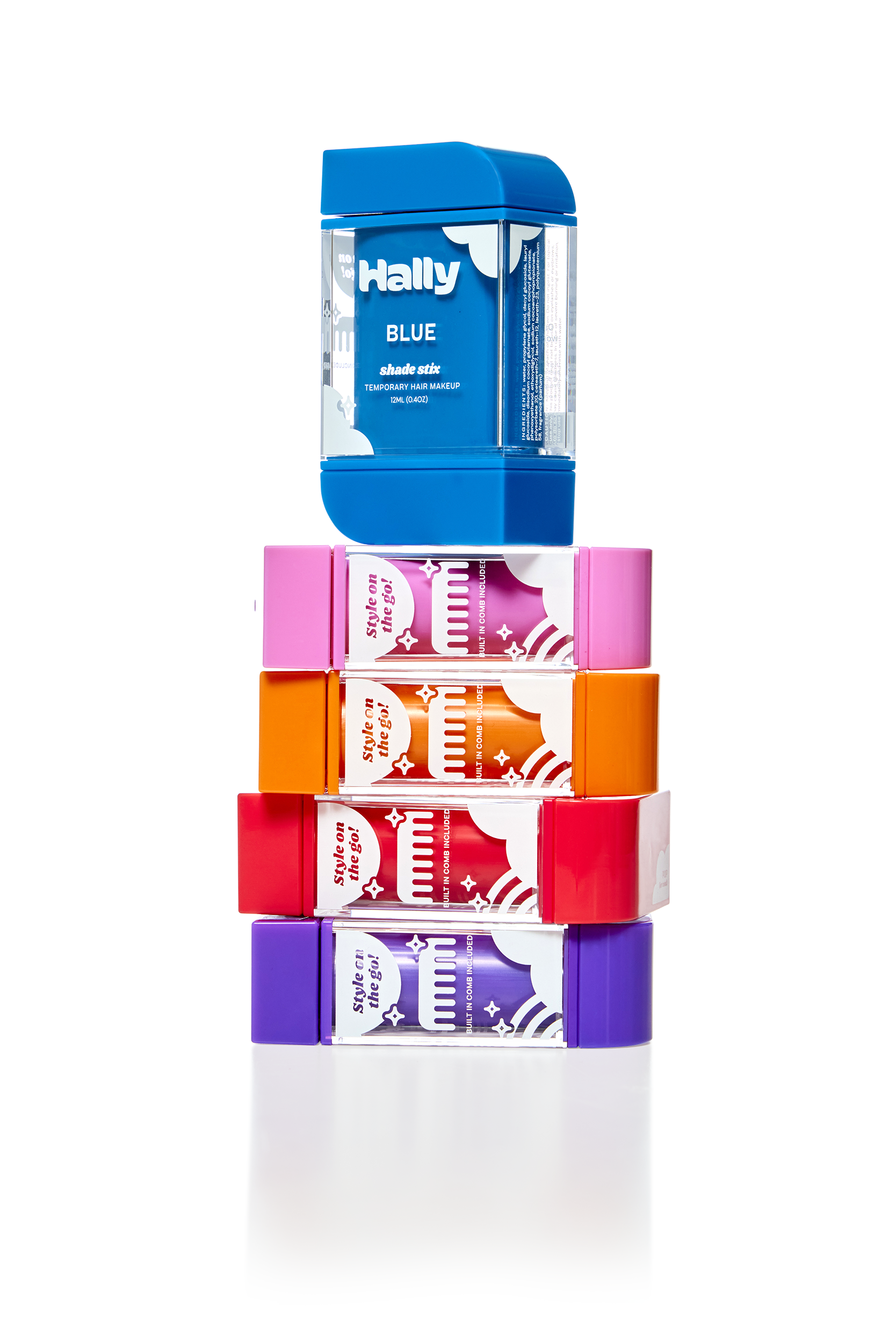 Shade Stix from Hally Hair are designed to make temporary hair coloring intuitive, effective, and mess-free. Unlike waxes, liquids, and chalks, Shade Stix’s special product formulation achieves even distribution for all hair types and hair colors. The product’s applicator wand is designed to distribute color without interfering with the hair’s natural texture, curl, or styling. Tiny teeth distributed across the applicator wand separate individual hair strands, keeping hair aligned in its place while distributing the product. Geometric flutes were designed along the applicator to collect and redistribute any excess product that might accumulate in varying amounts over the course use with a wide range of hair types and textures. The secondary comb works as a finishing step to perfect the product’s distribution throughout the hair and quicken drying time. The soft silicone teeth are strong enough to spread the product, while being flexible enough to not interfere with the user’s hair styling. Shade Stix are an innovative new packaging solution that distributes temporary hair color for a fun, hassle-free experience.