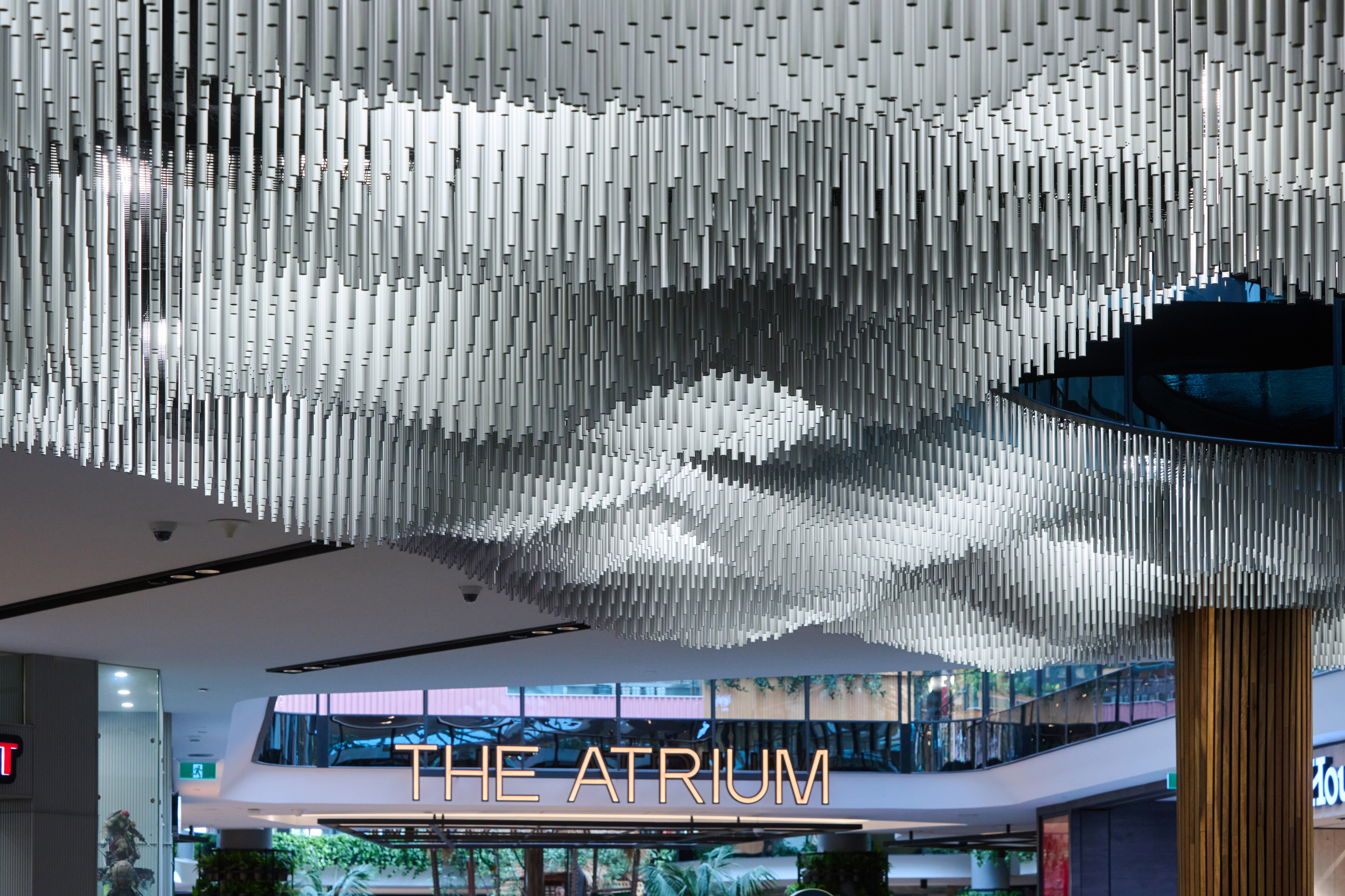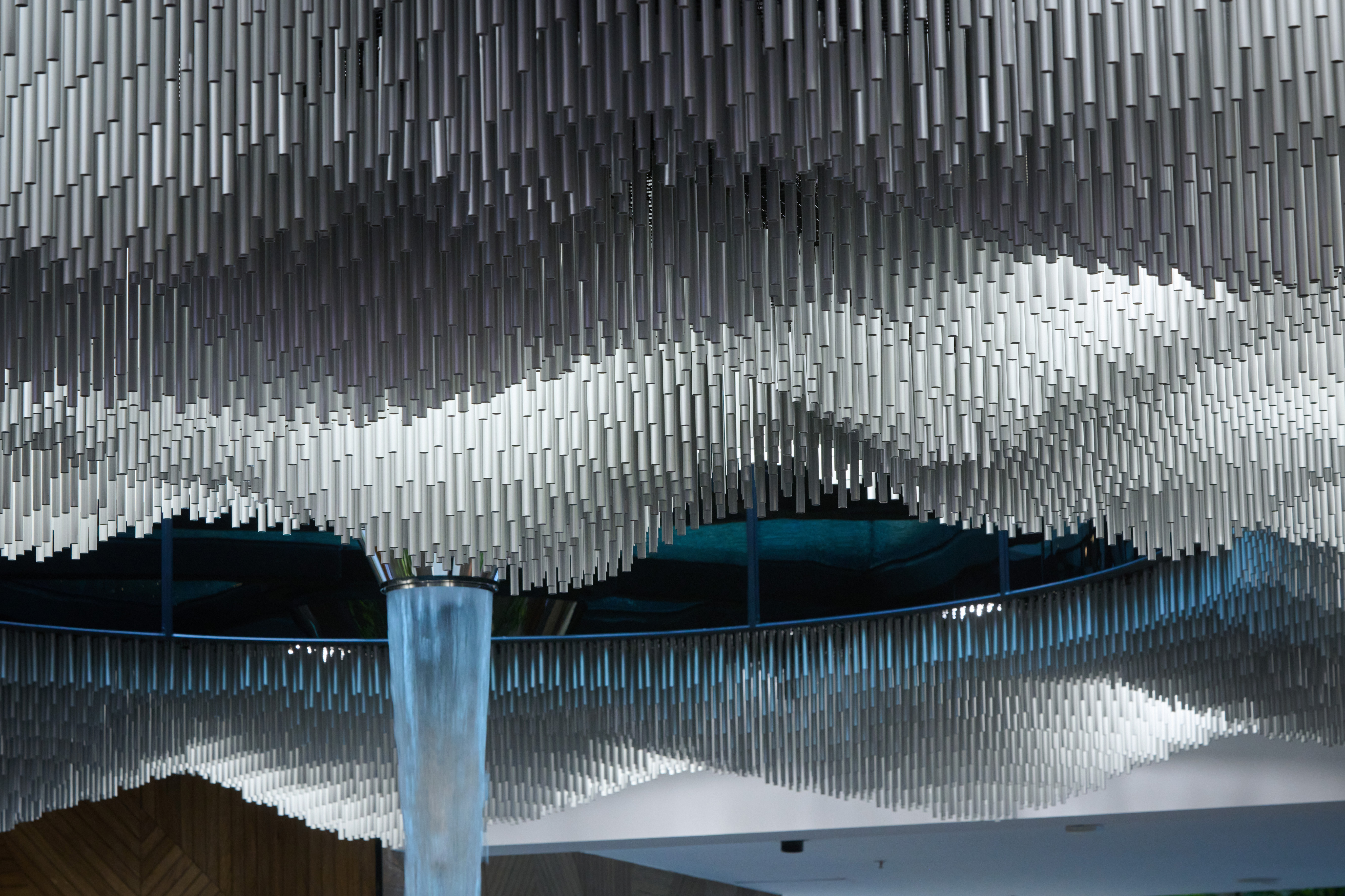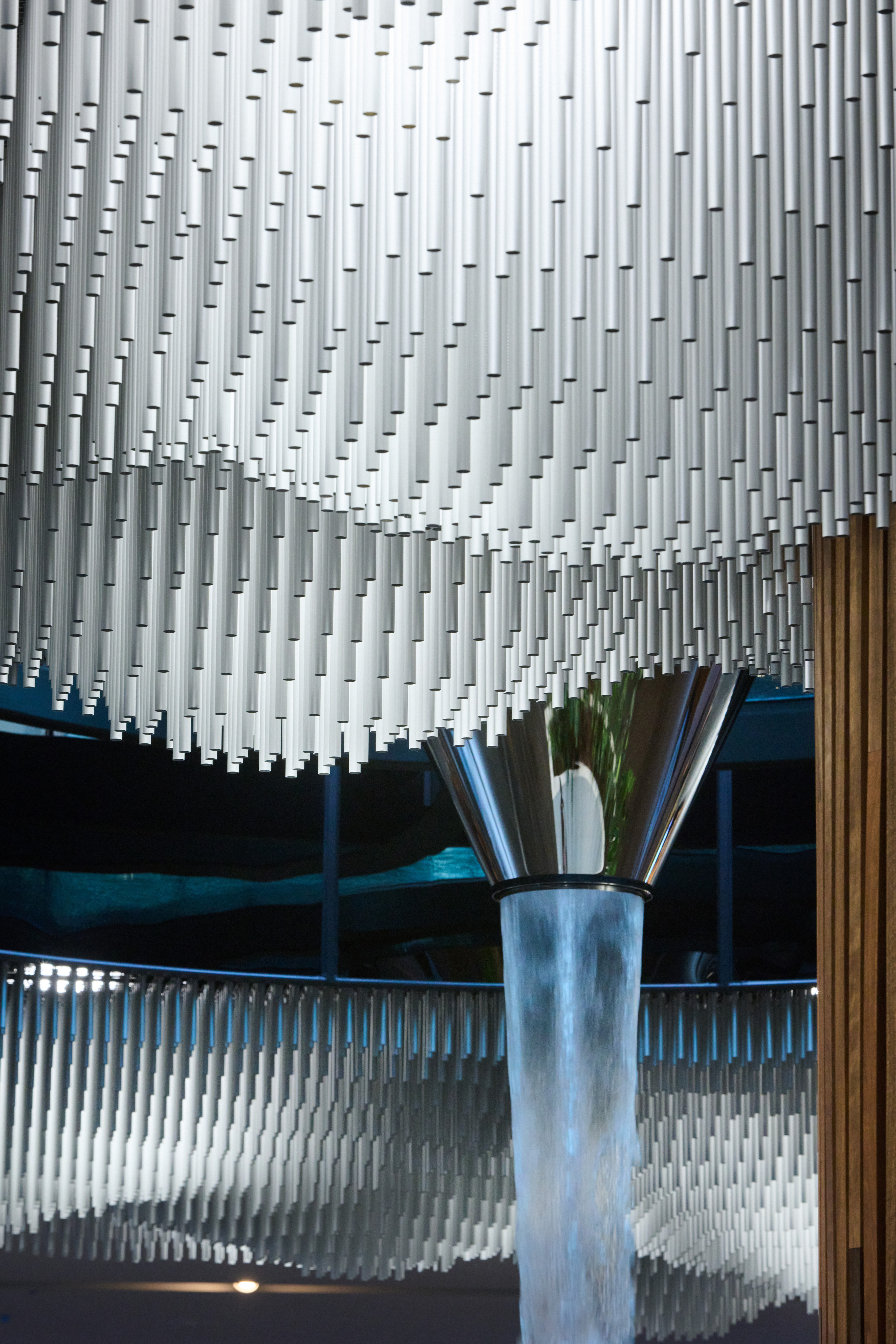 The installation is a visually stunning, refined and poetic piece. An expanse of anodised tubes form an undulating cloud, surrounding a cascading water feature. The observer experiences dappled light that filters through the moire of suspended tubes like the sun through a cloud. Perhaps the installation’s best measure of success are the intrigued shoppers, phones in hand, getting photos for their socials.
