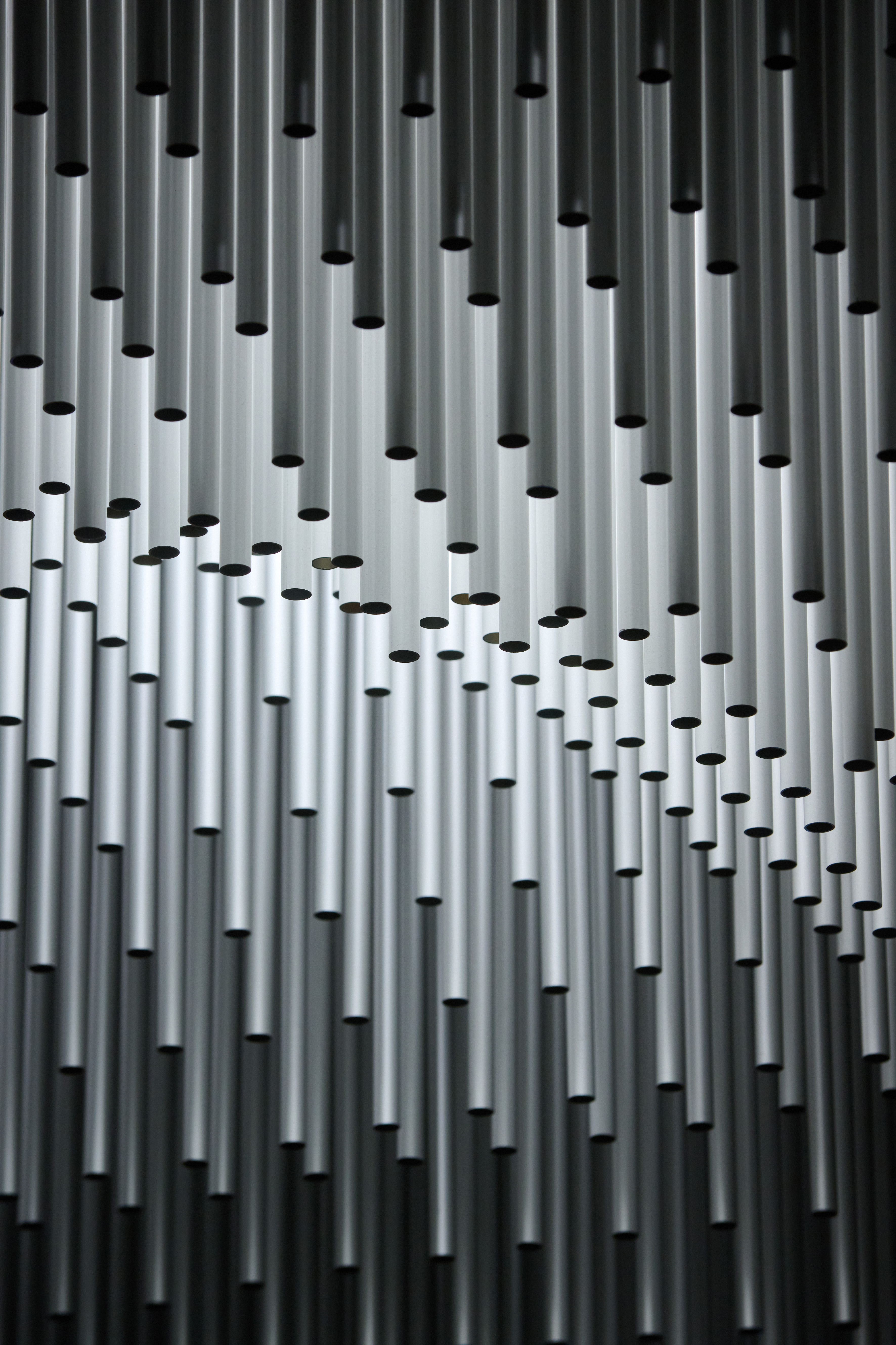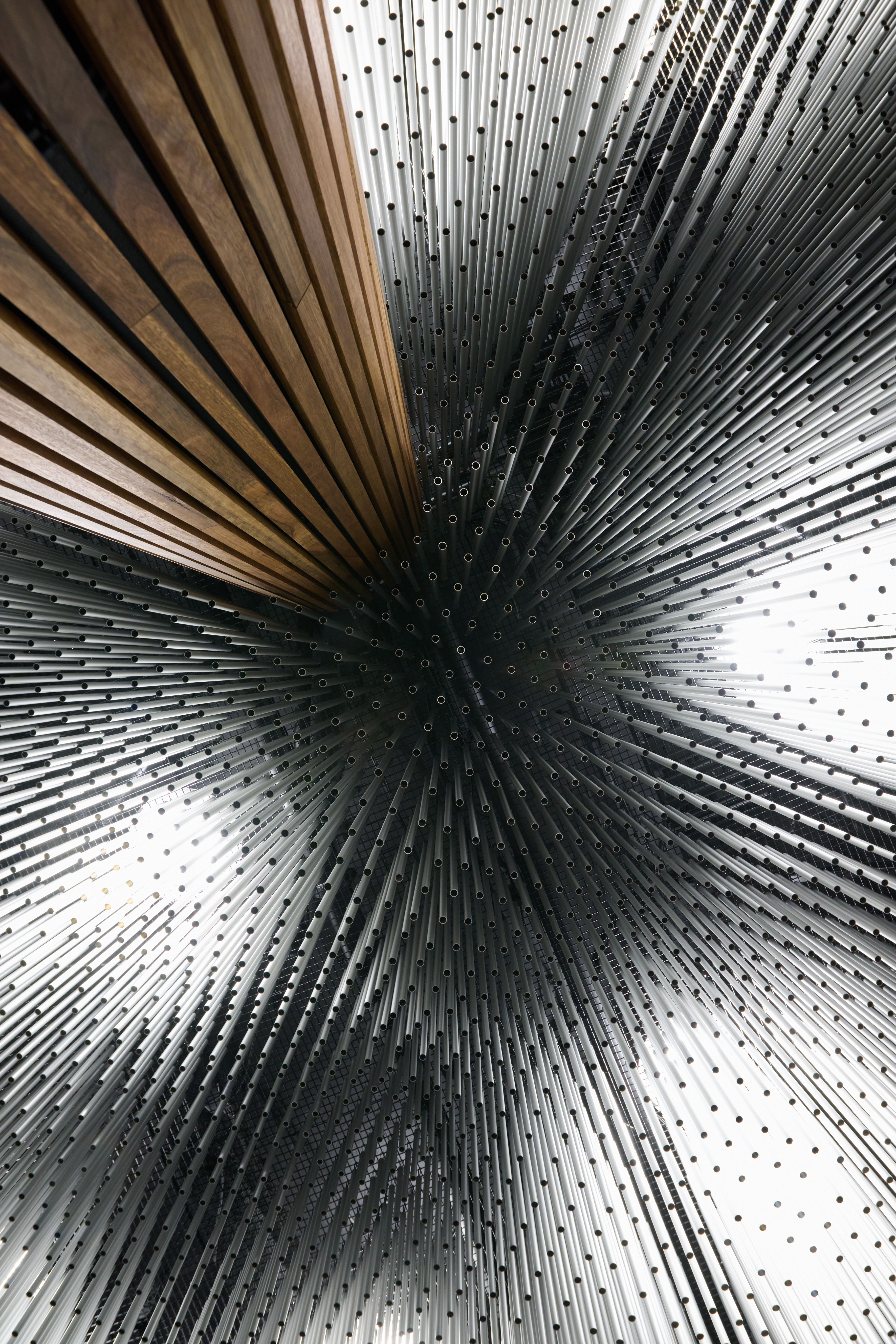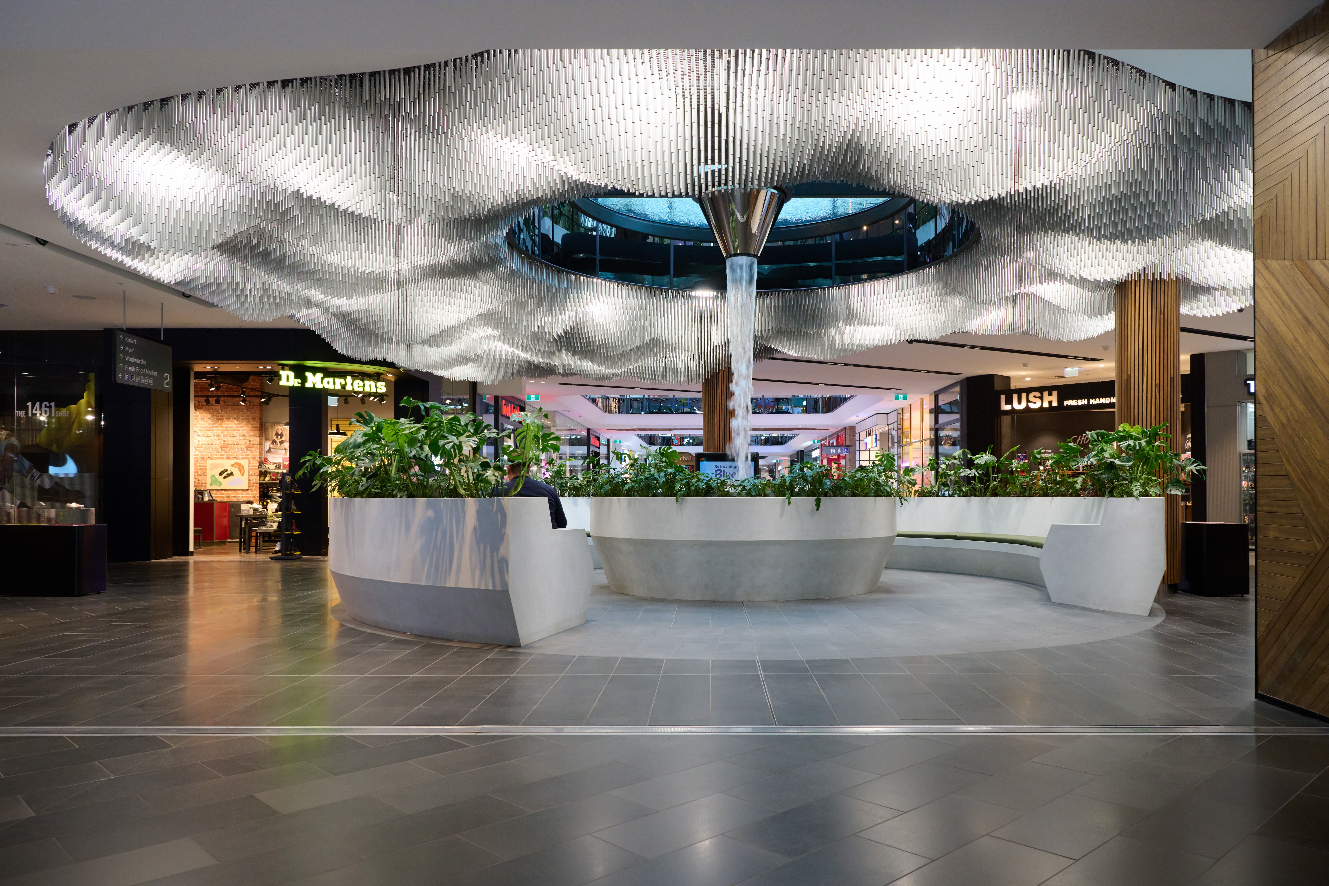 The installation is a visually stunning, refined and poetic piece. An expanse of anodised tubes form an undulating cloud, surrounding a cascading water feature. The observer experiences dappled light that filters through the moire of suspended tubes like the sun through a cloud. Perhaps the installation’s best measure of success are the intrigued shoppers, phones in hand, getting photos for their socials.
