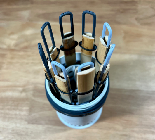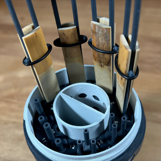Reed Reel is the first case ever designed with multi-instrumentalists in mind, who often need to carry around multiple reed cases to accommodate the different types of reeds they need to carry. Reed Reel solves this with eight magnetic slots that hold interchangeable reed holders, so musicians can can choose how much of their case is dedicated to certain types of reeds. This allows users, like a musician who plays both oboe and saxophone, to only have to carry around a single high-quality case.