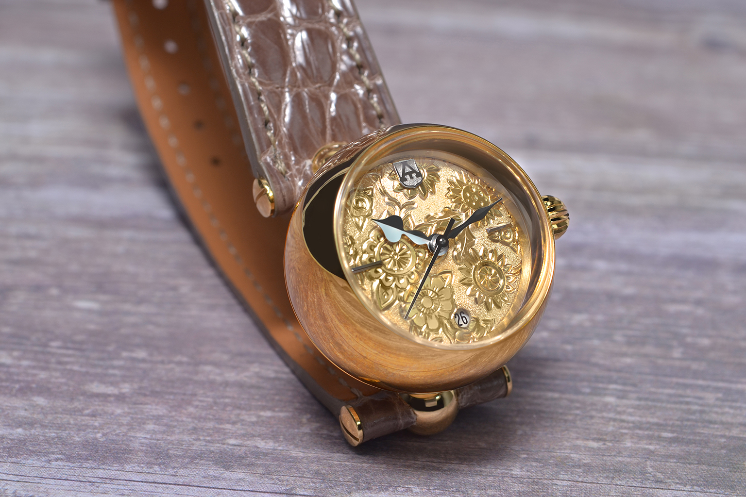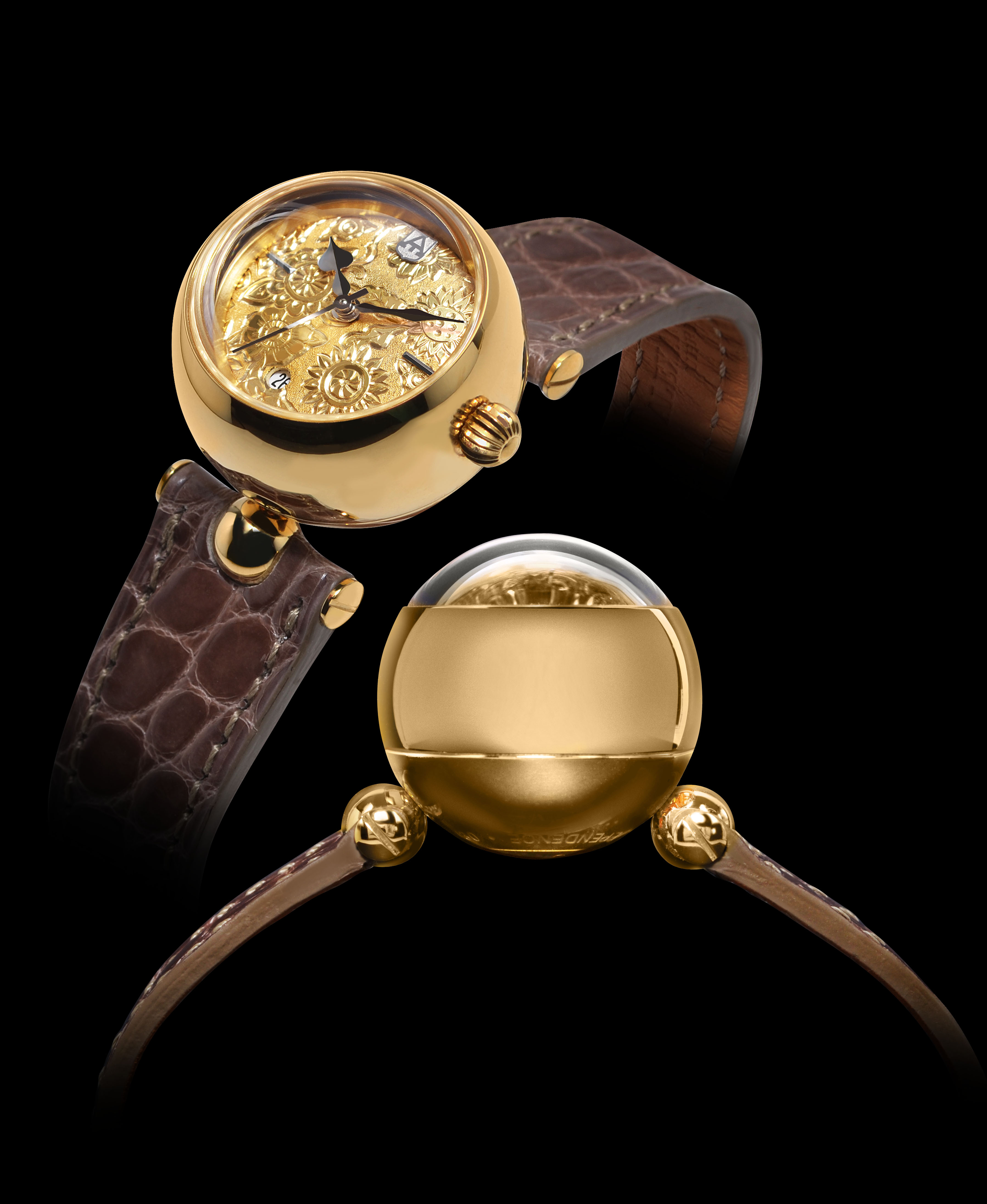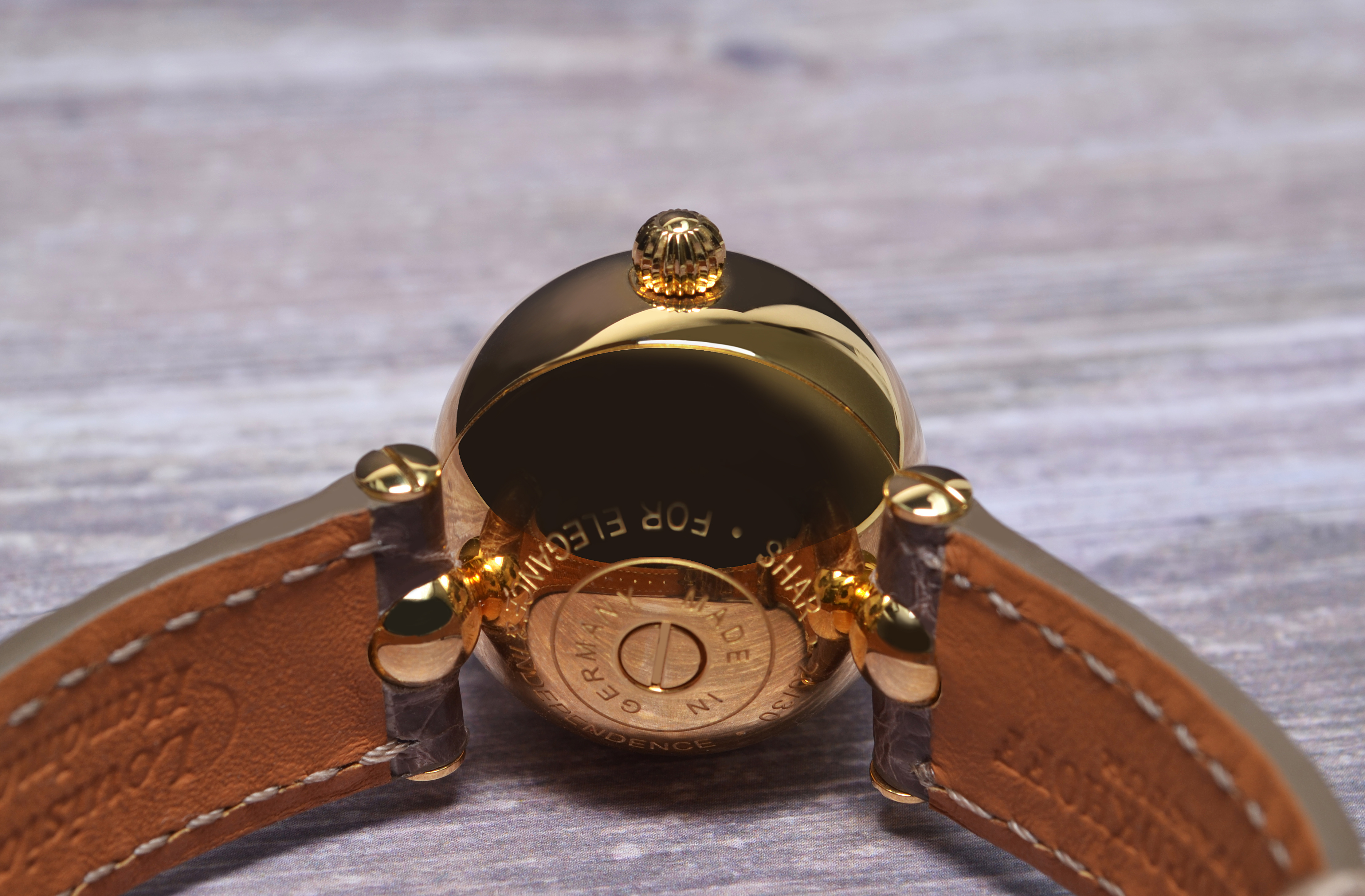 The gold-plated case and the sapphire crystal on the front are united in the shape of a sphere. To connect the bottom and the body of the case without additional holes, a single-screw design was developed. The screw is located in the center of the caseback and connects the two parts in a waterproof way. The sapphire crystal is perfectly matched to the spherical shape and blends almost seamlessly with the case.