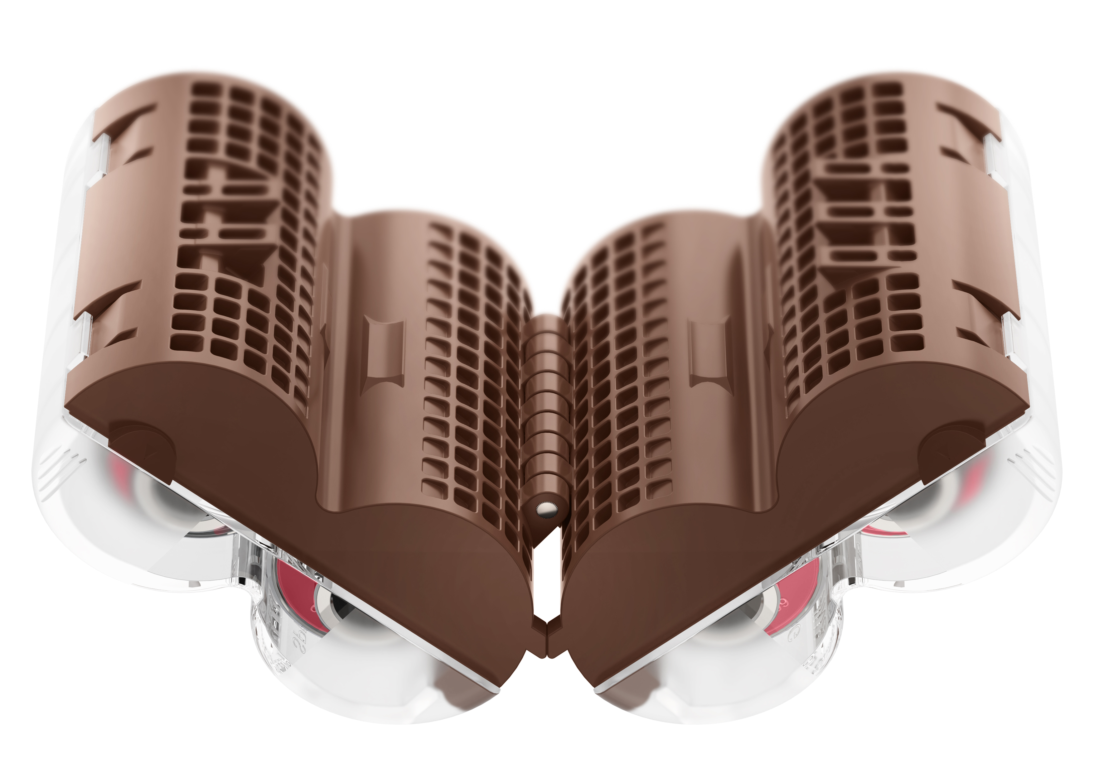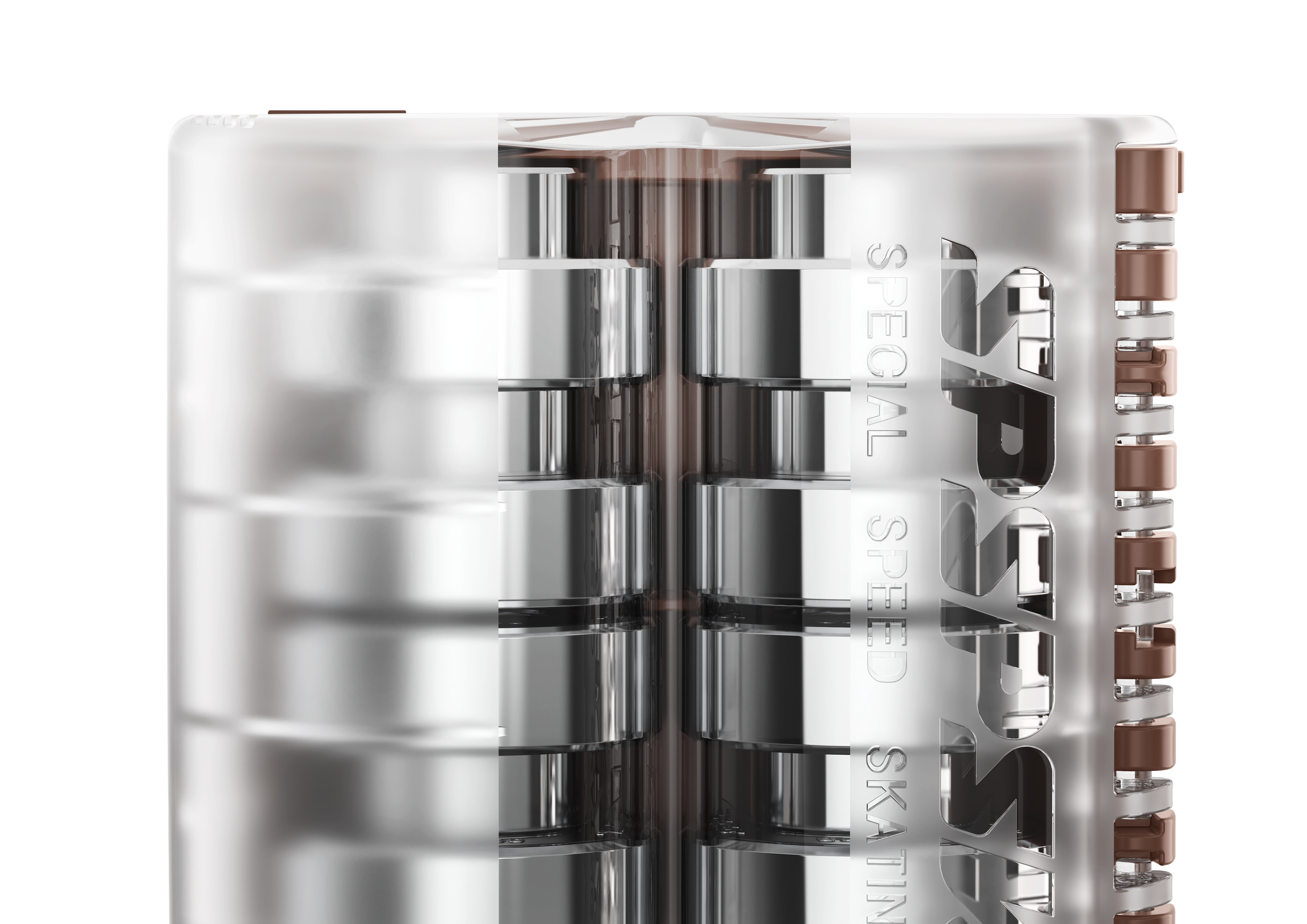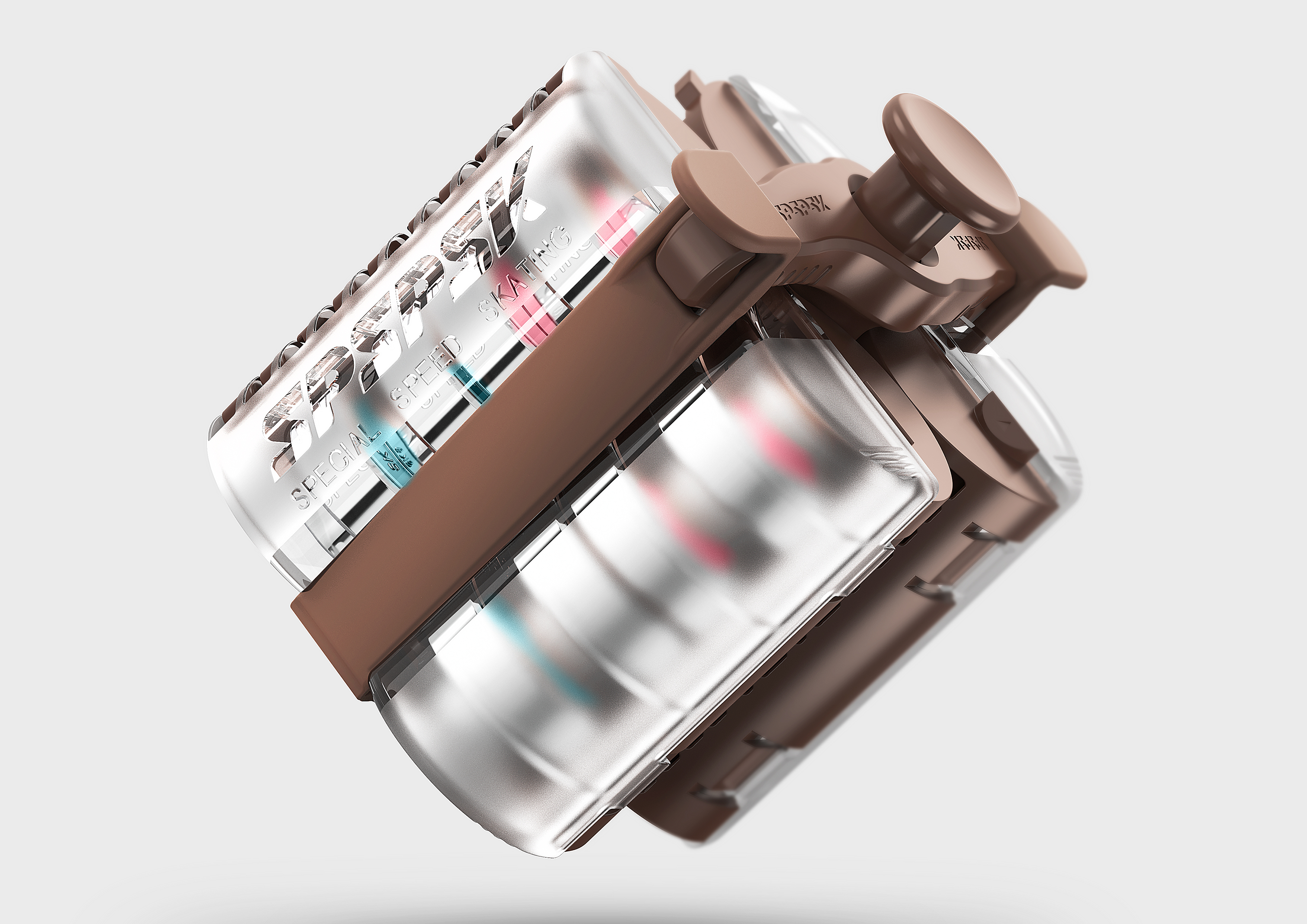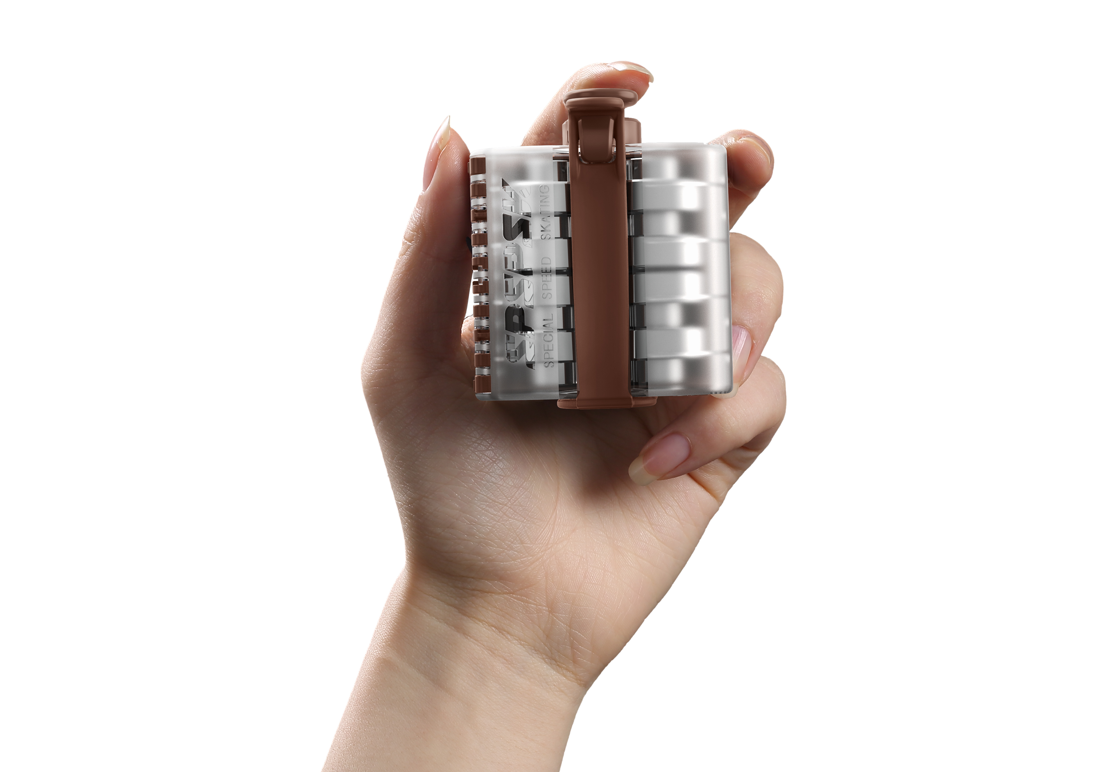 The two storage cavities are connected by a hinge, which enables the product to be unfolded or folded. The open and unfolded case looks like a rushing skating racer who are spreading the wings. When closed and folded, the storage case, like a lump of jade, is comfortable to grip, with the compact body contributing to high portability. The lid with the frosted sides and the transparent middle not only enhances aesthetic attraction of the product, but also conveys most visual information. The bottom is designed with a mechanical style for senses of power and speed, suggesting that the ceramic ball bearings in this case will provide the best skating experience for users.